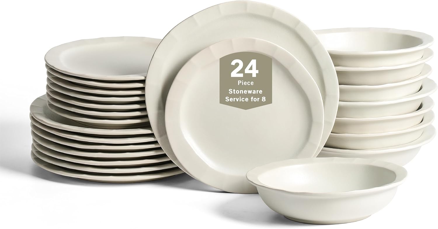 Stone Lain Oasis 24-Piece Dinnerware Set Stoneware, Dishwasher and Microwave Safe Plates and Bowls Set, Dish Set for 8, White