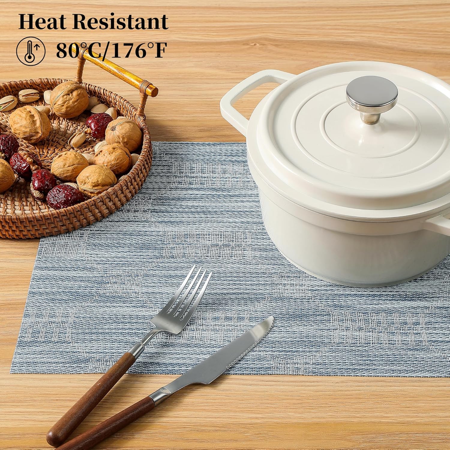 • Protects Your Table: Keep your table safe from scratches and spills with our heat-resistant placemats. They can withstand temperatures up to 176℉(80℃) and help keep food warm. Add style to your dining setting while ensuring table protection