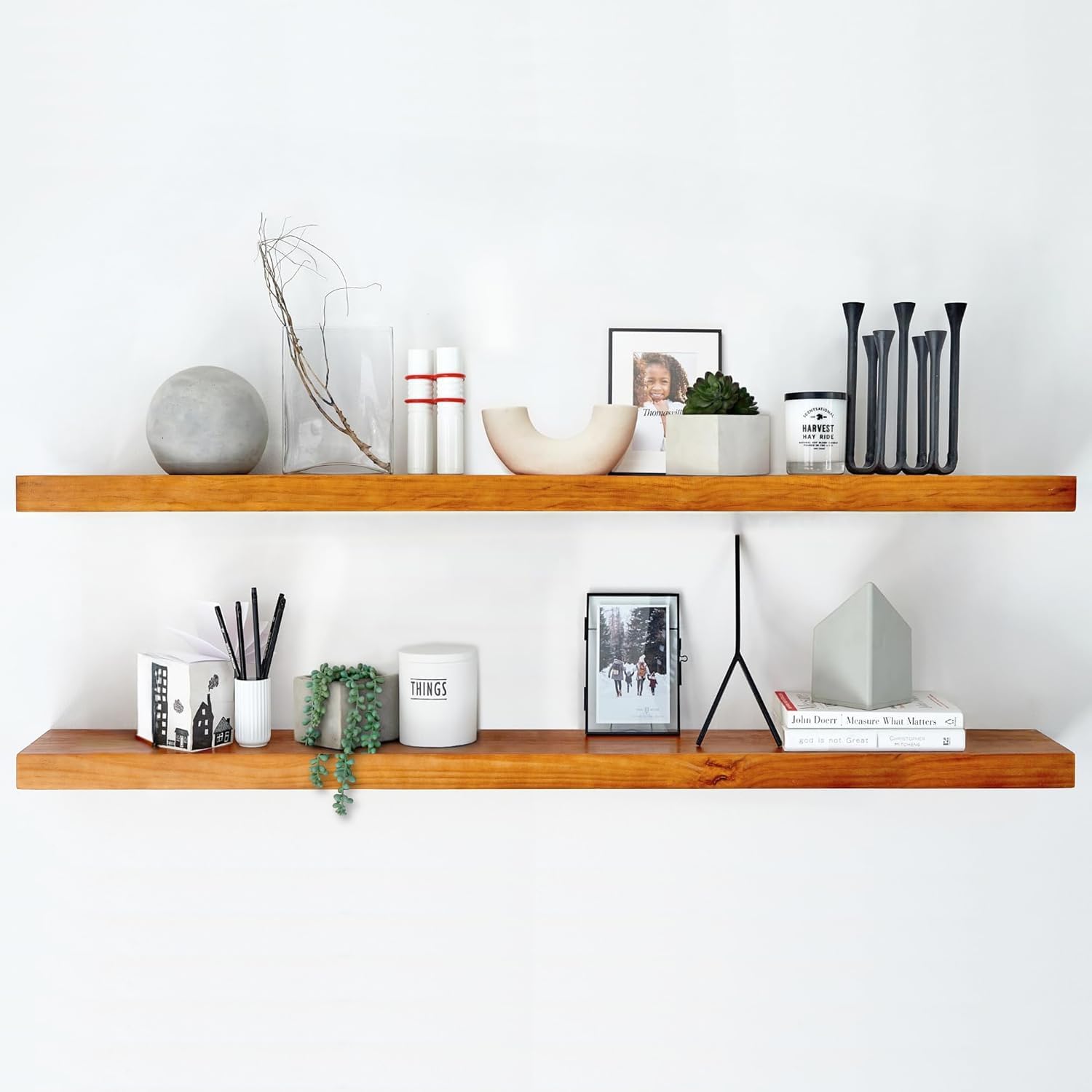 - AUTHENTIC WOOD GRAIN - Enjoy the timeless elegance of real wood. Handcrafted from the finest 1.75" Thick natural pine wood measuring 60" Wide x 6.5" Deep x 1.75". Our shelves highlight the inherent charm and durability of high-quality wood. Each Shelf reveals its unique character of knots and natural wood grain; each ledge is a little different but equally stunning.