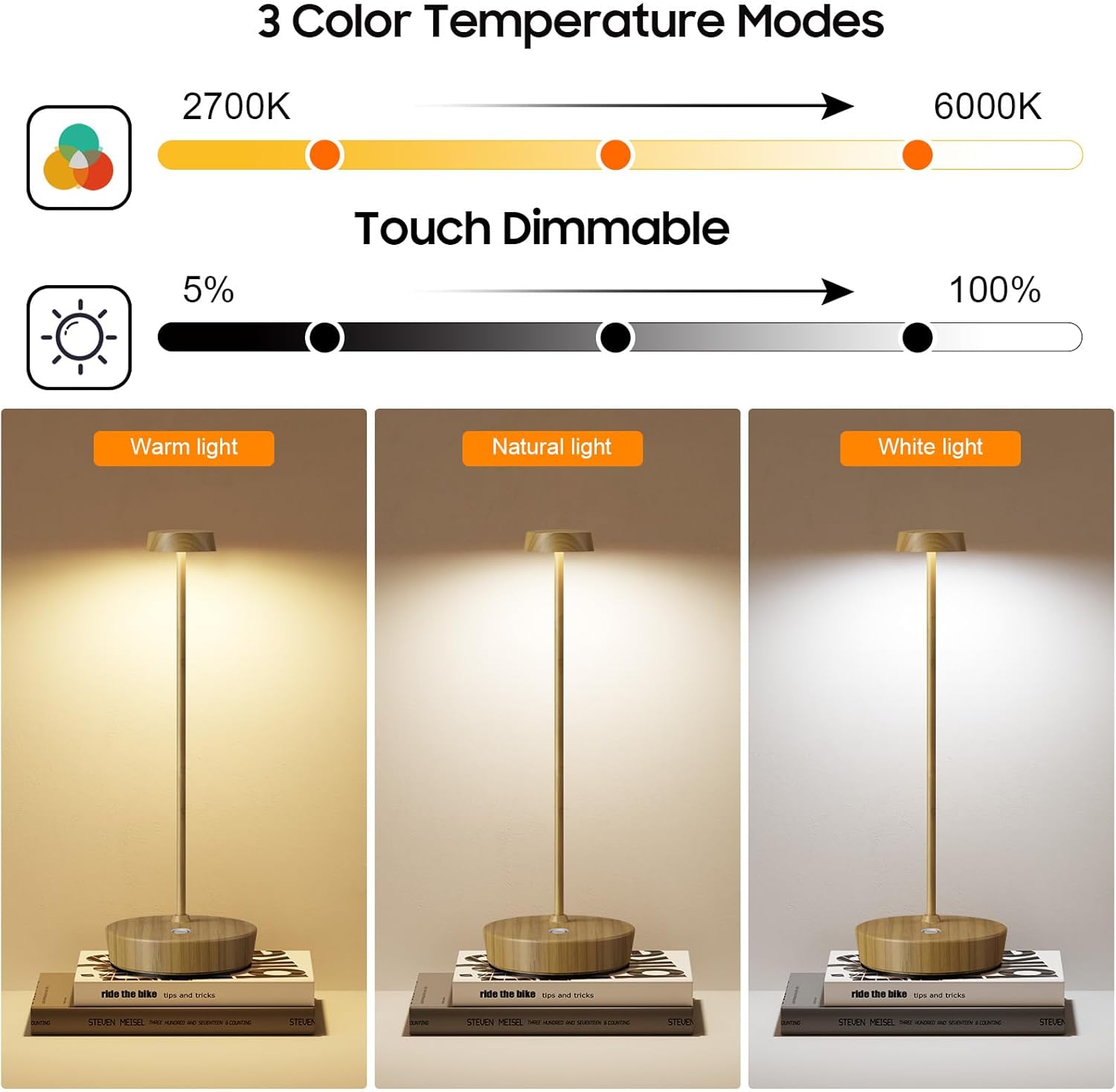 • Touch Dimming: The cordless desk lamp allows you to adjust the brightness of the light with a simple touch. It offers 3 different light colors, allowing users to freely adjust the brightness and color according to different usage scenarios and needs.
