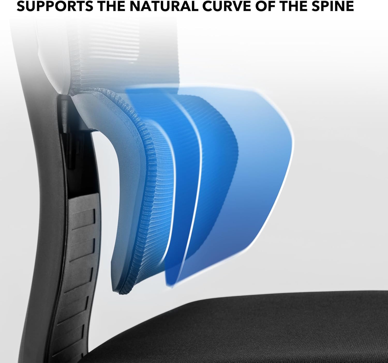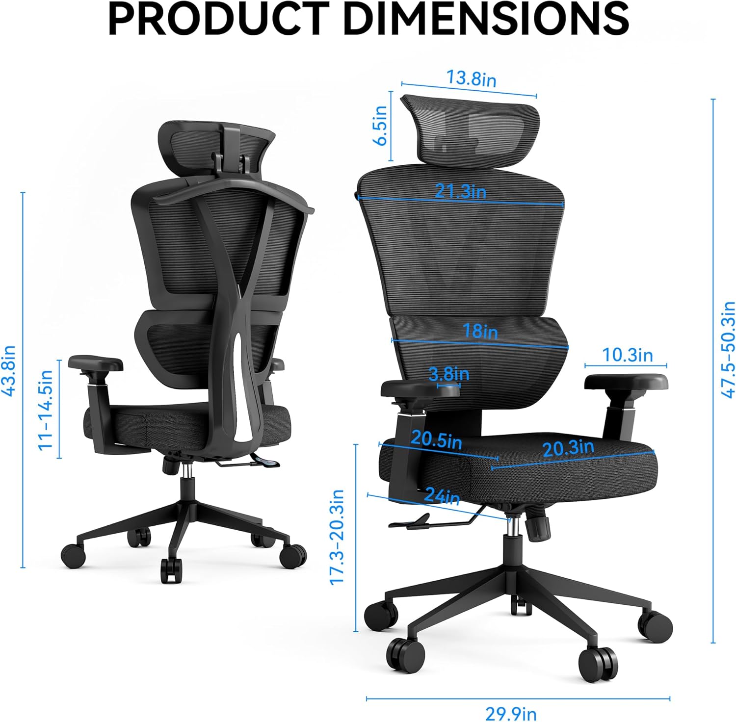 - 【Back & Neck Support】:This high back ergonomic office chair with lumbar support aligns your spine naturally. The breathable mesh back promotes airflow, and the adjustable headrest (30° tilt, 3-inch vertical) supports your neck, cervical spine, and shoulders. Ideal for home office desk use, computer work, or gaming setups.