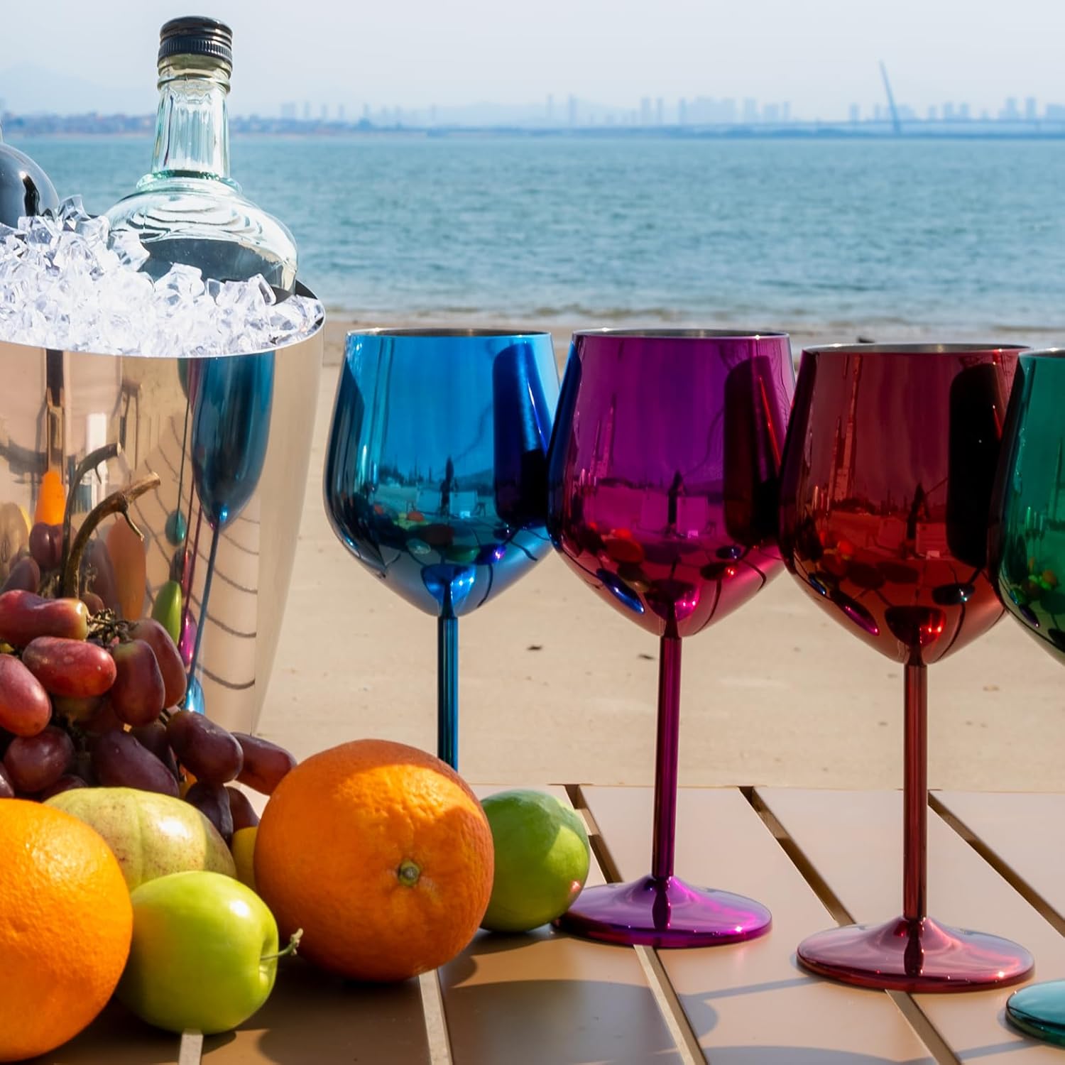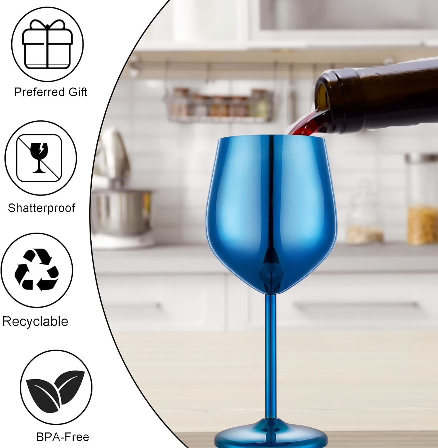 • Elegant Design - Expertly hand-polished to perfection, these stainless steel wine glasses feature a luxurious electroplated finish with a sophisticated metallic sheen. The large capacity 18 ounces capacity and weighted flat base provide exceptional stability, while the graceful long stem enhances both visual elegance and practical functionality - allowing you to swirl your wine with confidence to fully release its aromatic bouquet