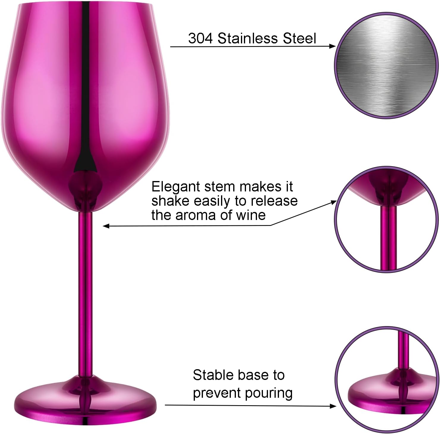 • Elegant Design - Expertly hand-polished to perfection, these stainless steel wine glasses feature a luxurious electroplated finish with a sophisticated metallic sheen. The large capacity 18 ounces capacity and weighted flat base provide exceptional stability, while the graceful long stem enhances both visual elegance and practical functionality - allowing you to swirl your wine with confidence to fully release its aromatic bouquet