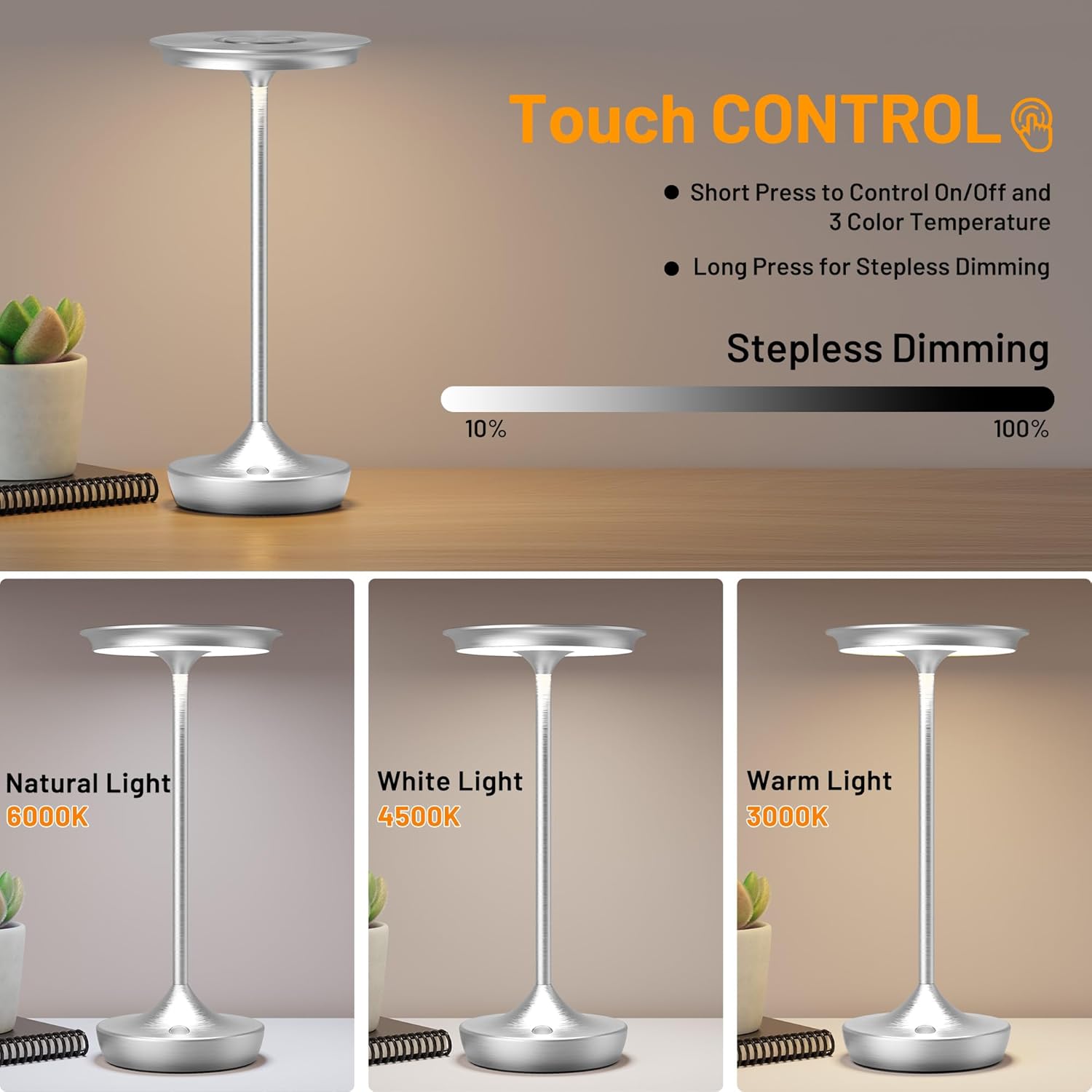 - 【Stepless/3 Level Touch Control Dimming】One-touch sensor switch on the button, short touch to switch 3 color temperatures - Warm light (3000K)/White light (4500K)/Natural light (6000K); long touch to adjust the brightness 100%-10%. Excellent dimming makes it easy to apply in various life scenarios
