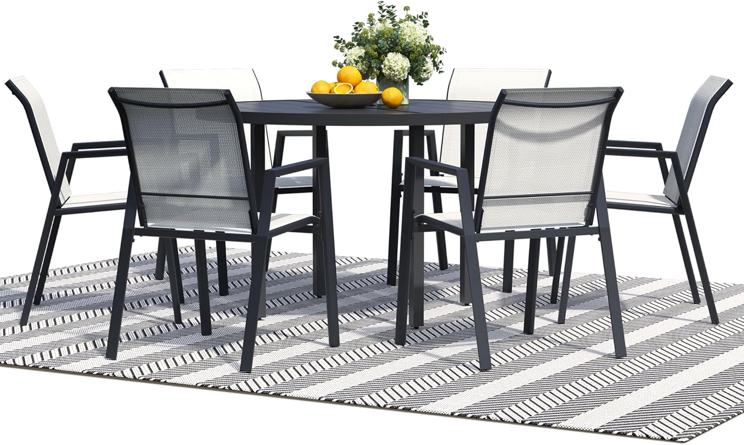 7 Piece Outdoor Dining Set, Patio Table and Chairs Set of 6, 47" Black Round Patio Table with 6 Oyster Beige Stackable Patio Chairs for Lawn, Garden, Porch