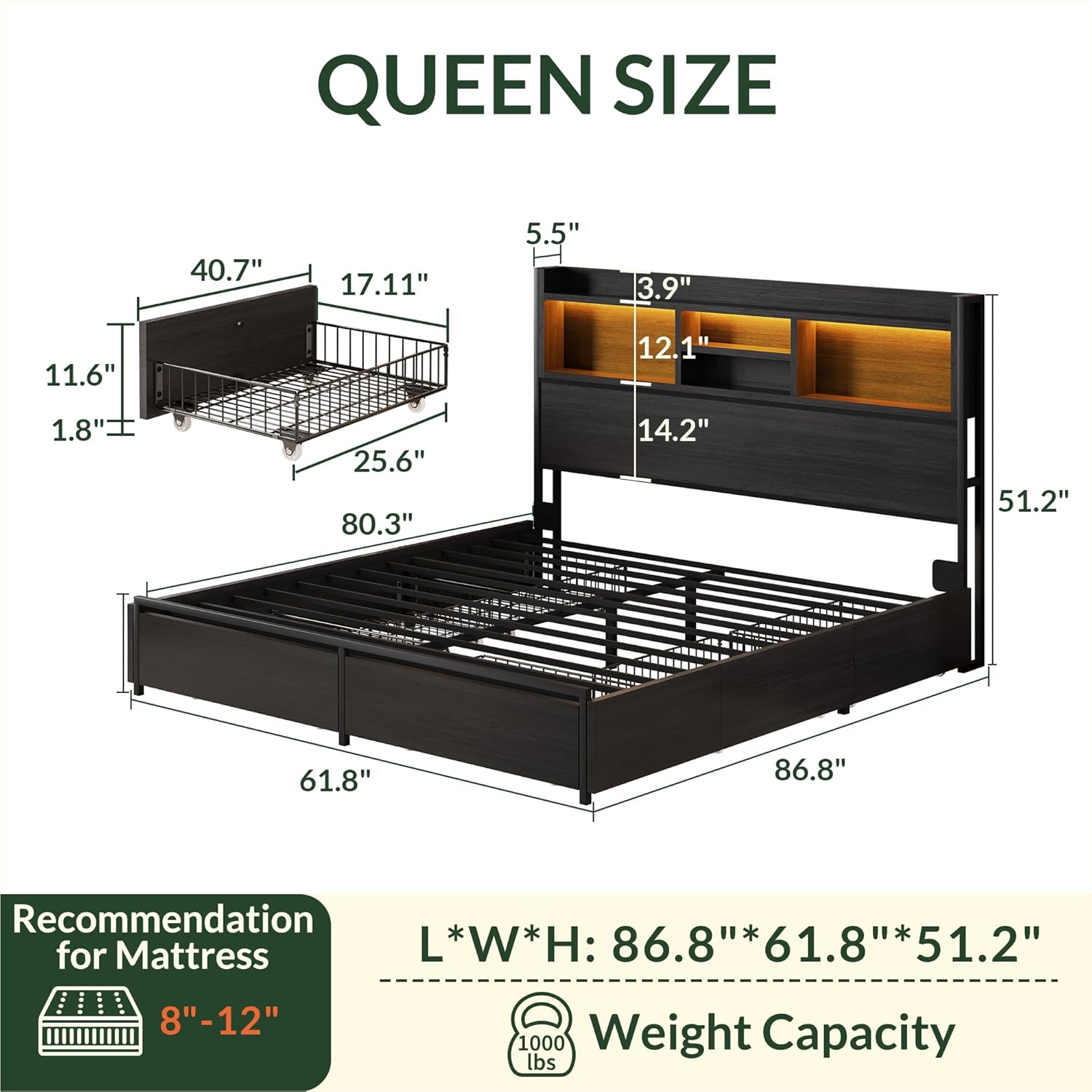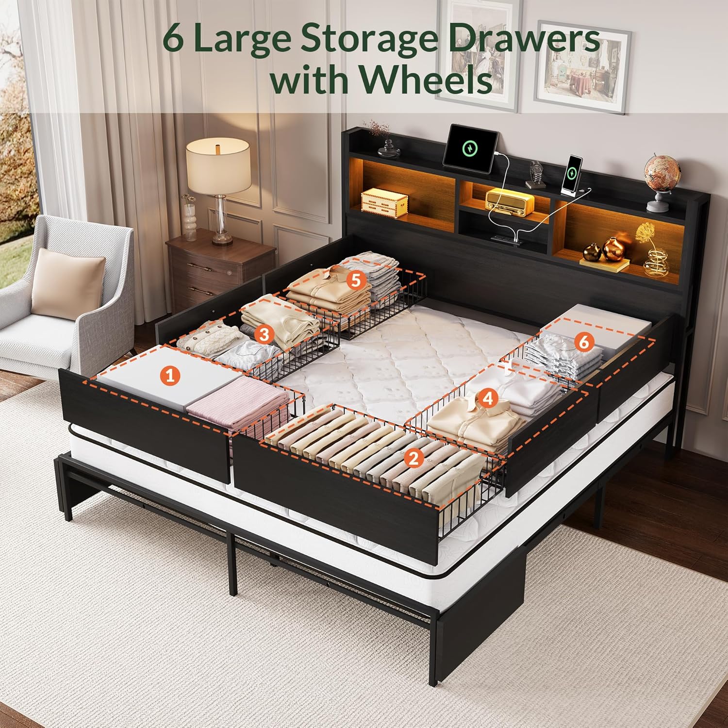 LARMACE Queen Size Bed Frame with 6 Storage Drawers and Headboard Wooden Platform Bed Frame with LED Lights and Charging Station Easy Assembly/No Box Spring Needed/Black