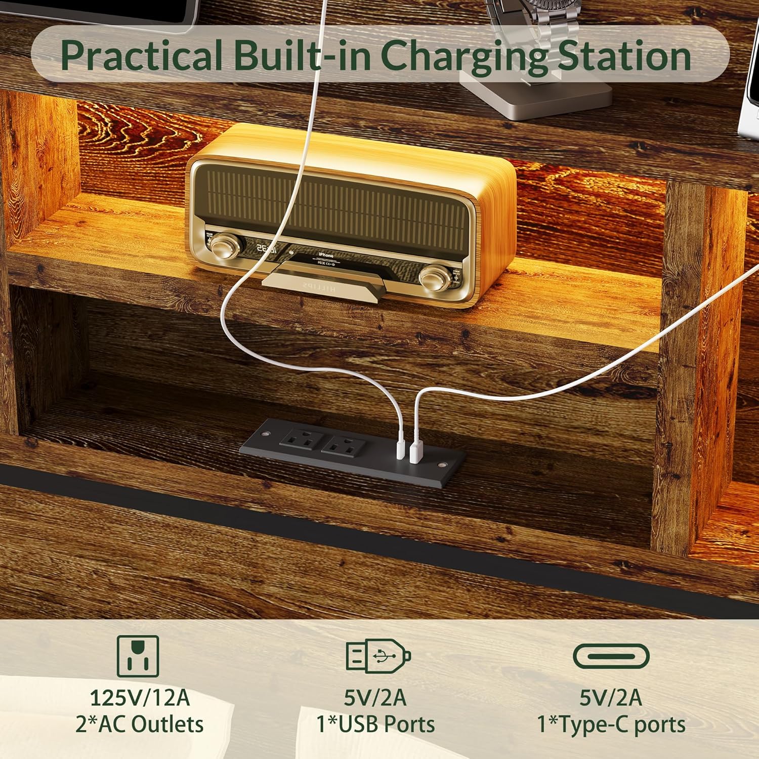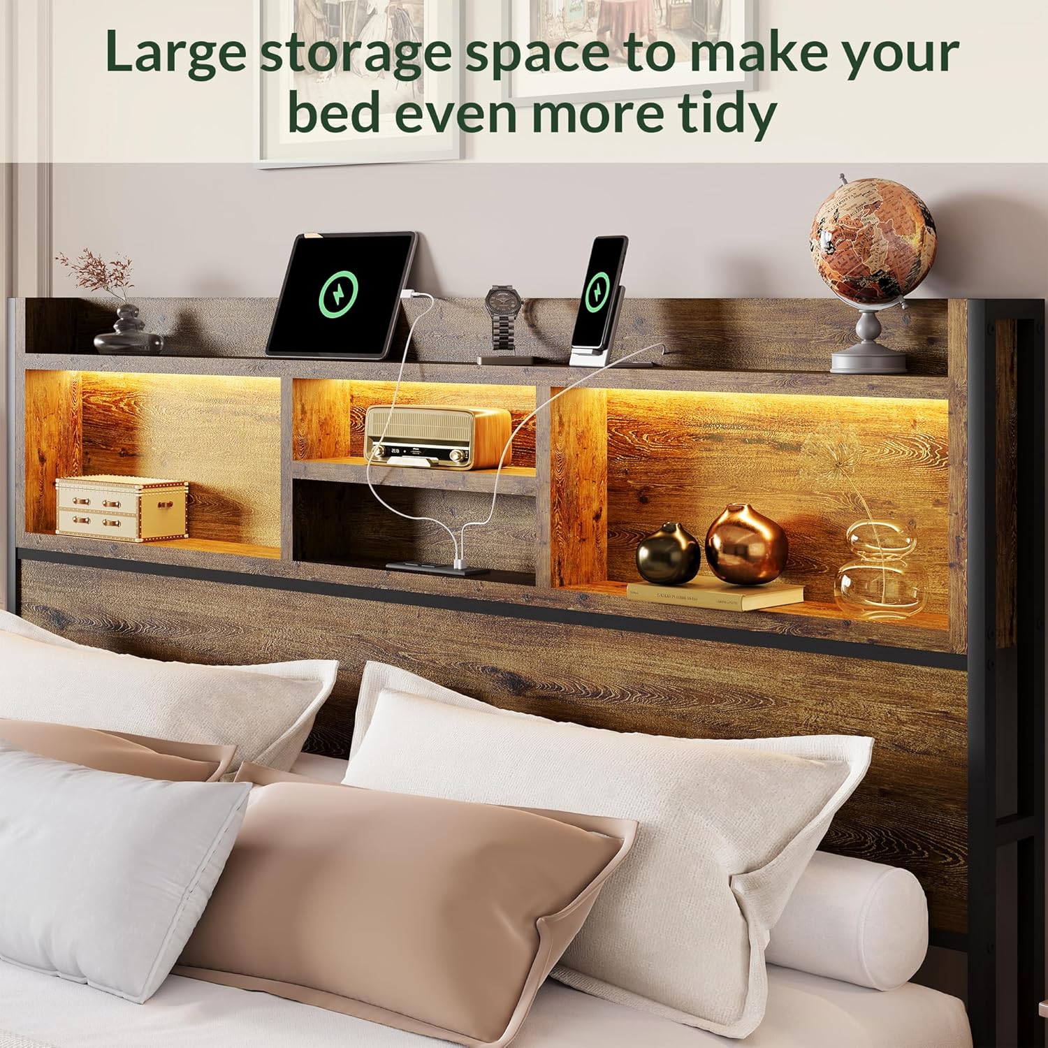 - 【Headboard with Charging Station】The Tall Bed Frame with Headboard is equipped,King Size bed frame with charging station is 2 power outlets & 1 USB ports and 1 type-C ports,The platform bed frame with storage can also store your clutter, making your bed look uncluttered