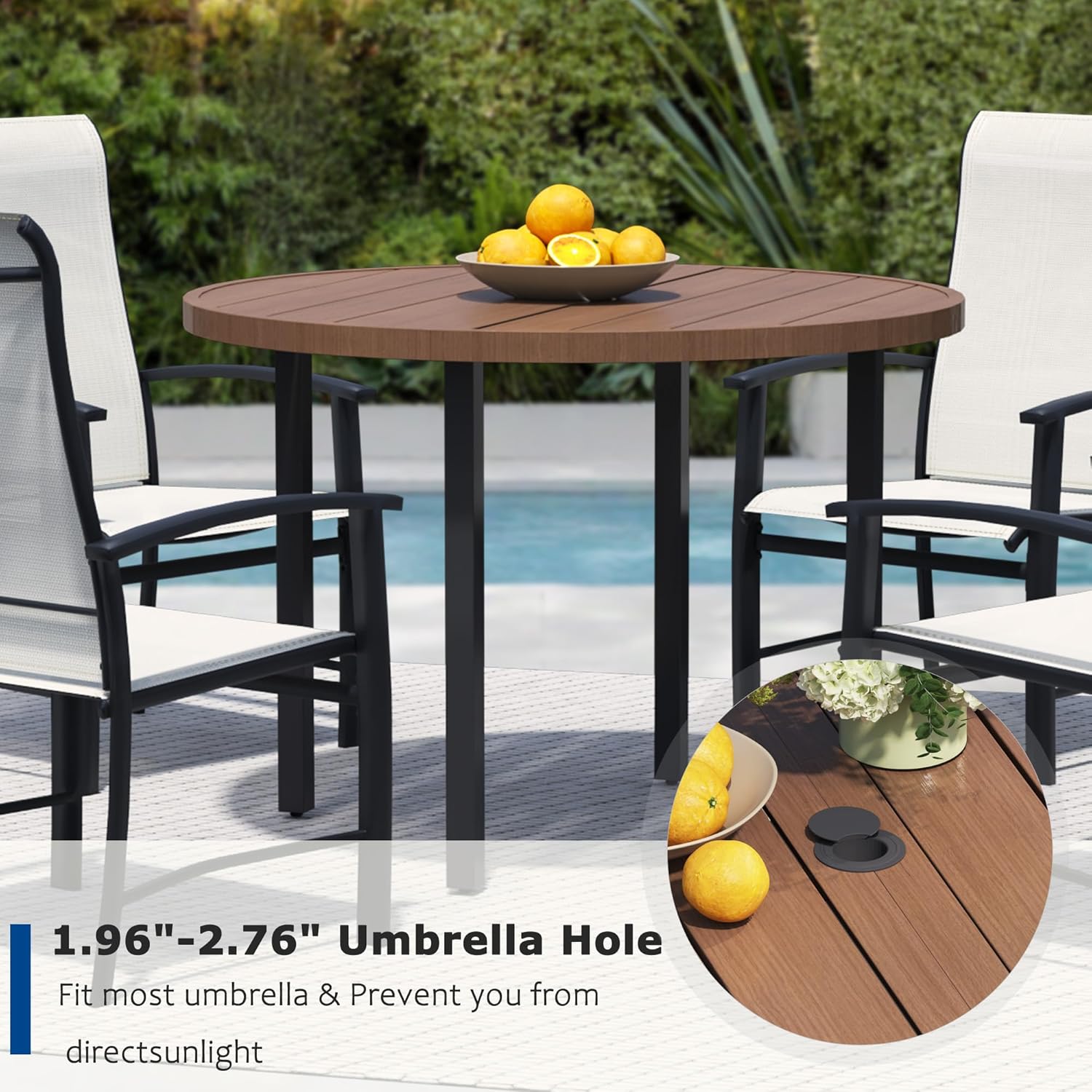 • 【Durable Round Table with Umbrella Hole】Featuring a 1.96"-2.76" adjustable umbrella hole, the sturdy patio table offers shade and UV protection, making it perfect for outdoor dining or relaxing by the pool, backyard, or deck