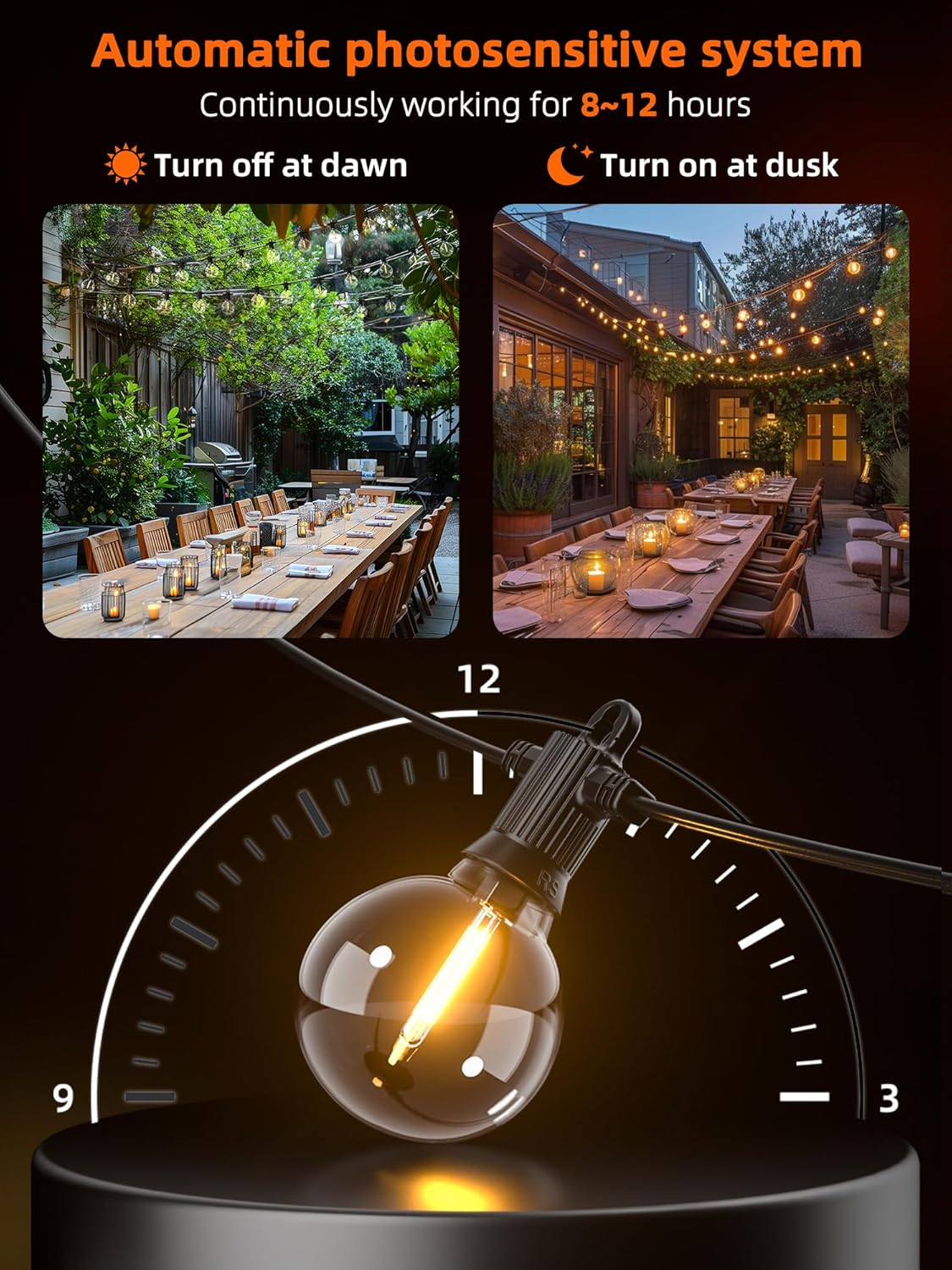 - DUSK TO DAWN LIGHTING: Kawaya patio lights solar powered come with a built-in light sensor that acts as your personal lighting assistant. It automatically detects the onset of dusk, turning the lights on to bathe your space in a comforting glow throughout the night. As dawn approaches, the solar patio lights seamlessly switch off, conserving energy and initiating the recharging process, ready to light up your nights again.