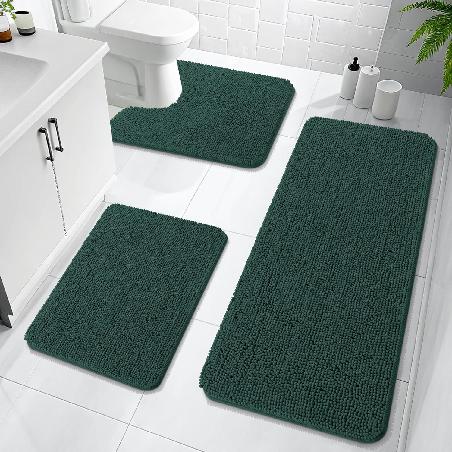 OLANLY Bathroom Rugs Sets 3 Piece, Soft Absorbent Chenille Bath Mat and U-Shaped Contour Toilet Rug, Quick Dry, Home Decor Accessories, Bath Mat Set for Floor (47"x20"+24"x16"+24"x20", Blackish Green)