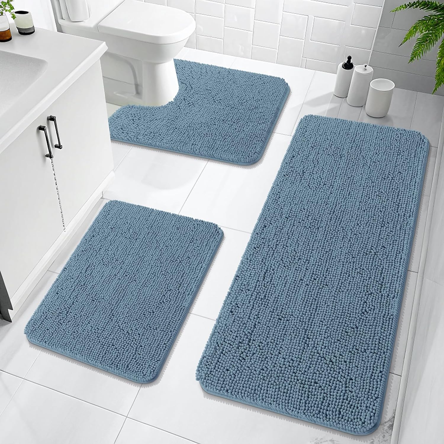 OLANLY Bathroom Rugs Sets 3 Piece, Soft Absorbent Chenille Bath Mats and U-Shaped Contour Toilet Rug, Quick Dry, Home Decor Accessories, Bath Mat Set for Bathroom (47"x20"+24"x16"+24"x20", Airy Blue)