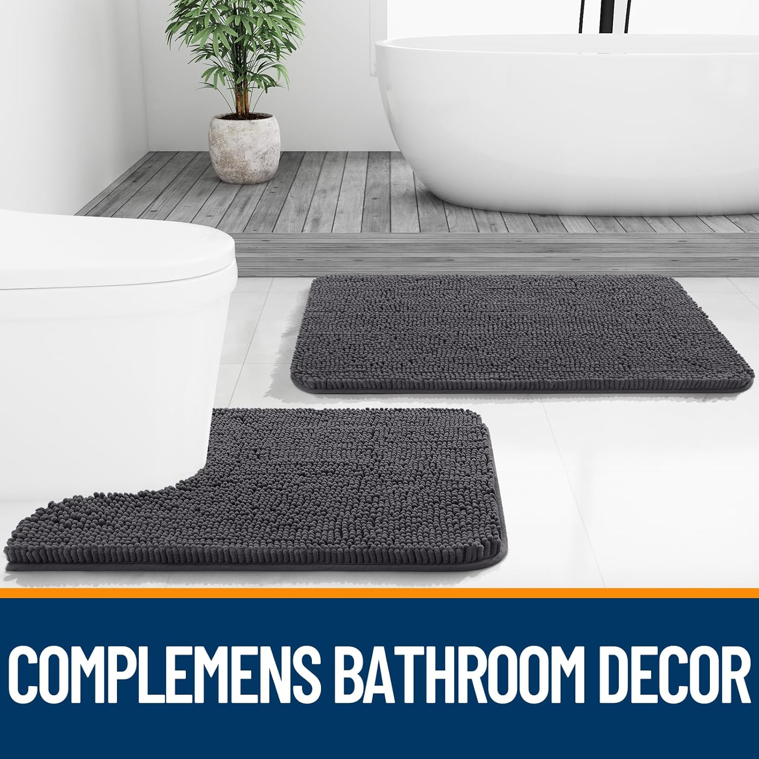 OLANLY Bathroom Rugs Sets 2 Piece, Soft Absorbent Chenille Bath Mats and U-Shaped Contour Toilet Mat Area Rug Set, Machine Washable Bath Carpet, Home Decor Accessories(30"x20"+24"x20", Dark Grey)