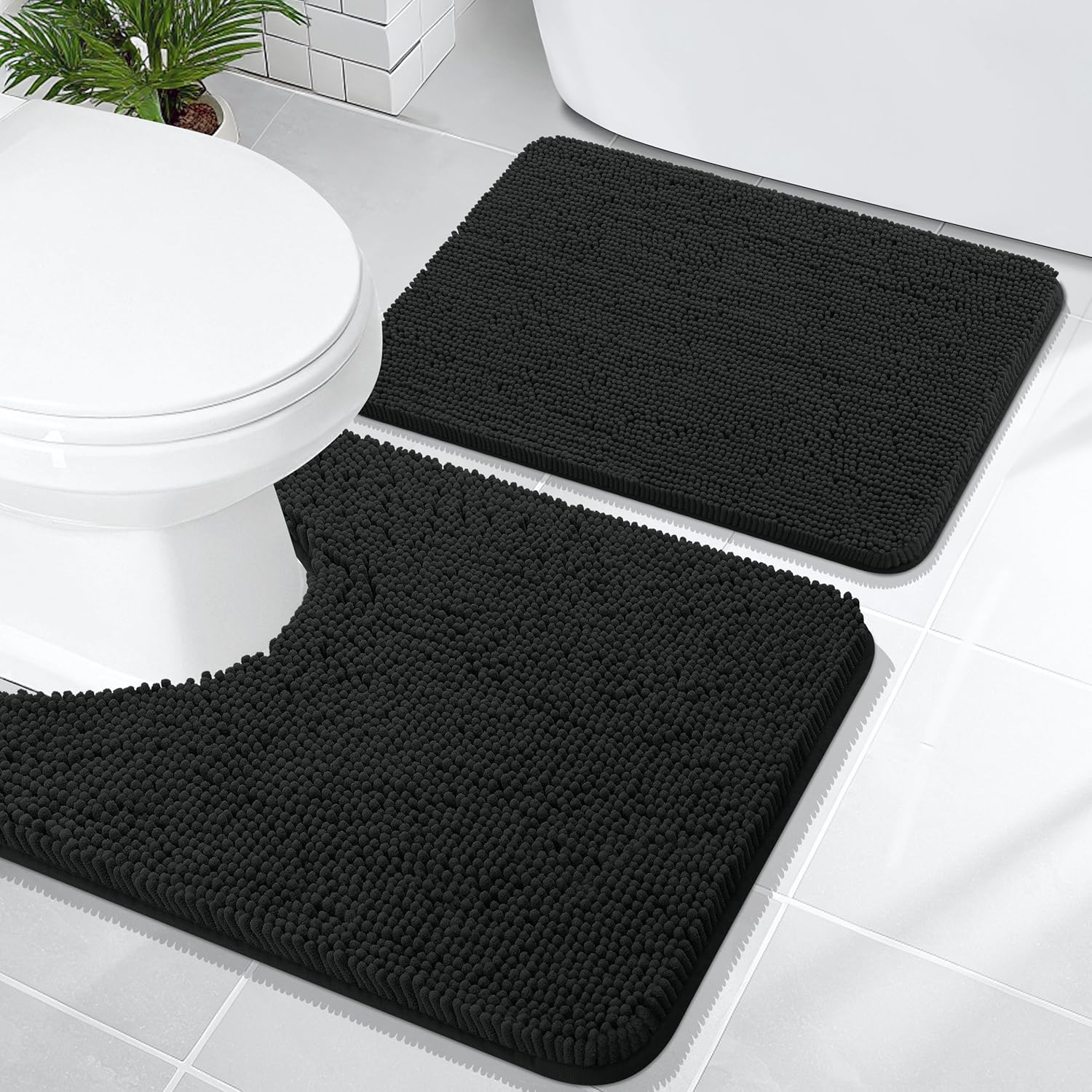 OLANLY Bathroom Rugs Sets 2 Piece, Soft Absorbent Chenille Bath Mats and U-Shaped Contour Toilet Mat Area Rug Set, Machine Washable Bath Carpet, Home Decor Accessories(24"x16"+24"x20", Black)