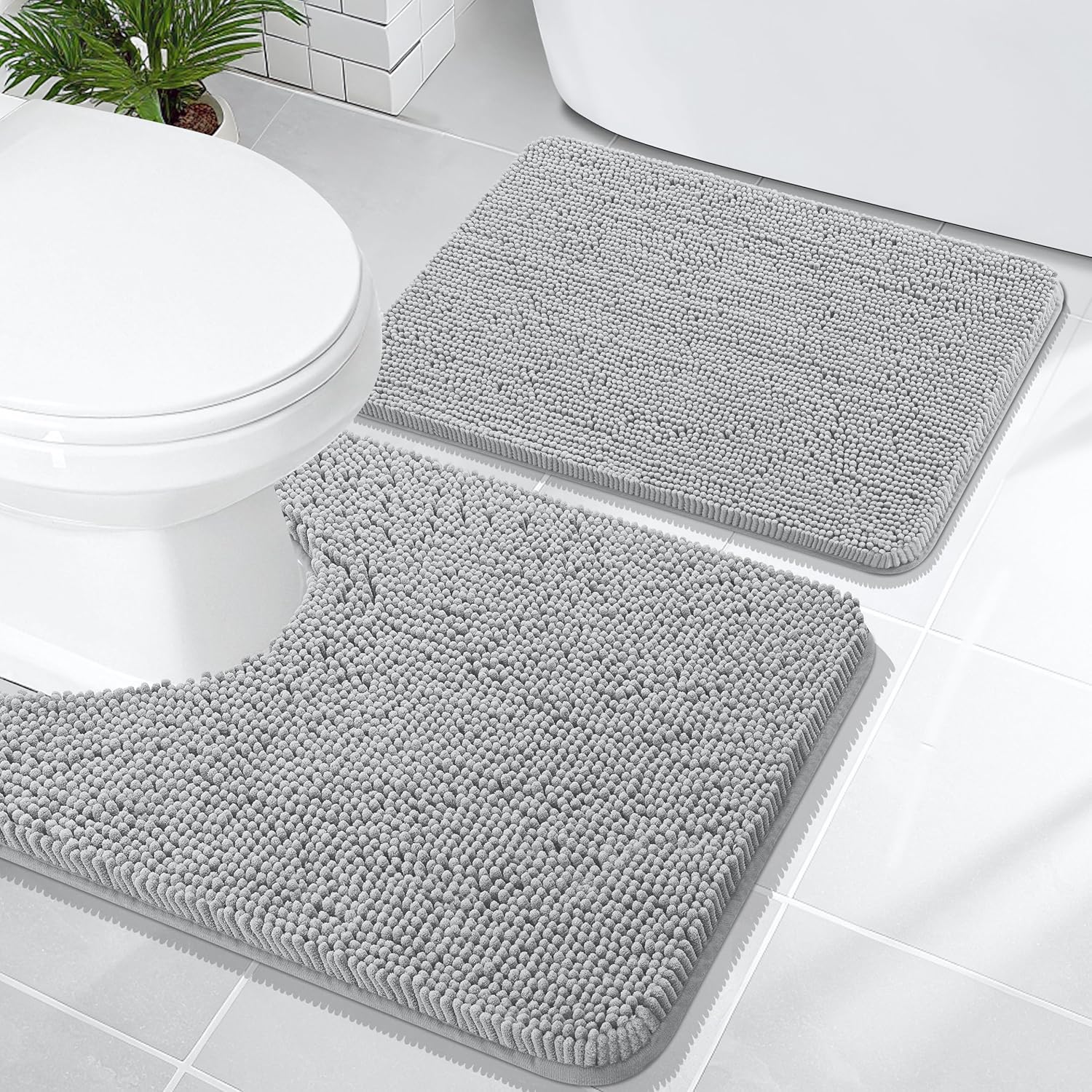 OLANLY Bathroom Rugs Sets 2 Piece, Soft Absorbent Chenille Bath Mats and U-Shaped Contour Toilet Mat Area Rug Set, Machine Washable Bath Carpet, Home Decor Accessories(24"x16"+24"x20", Light Grey)