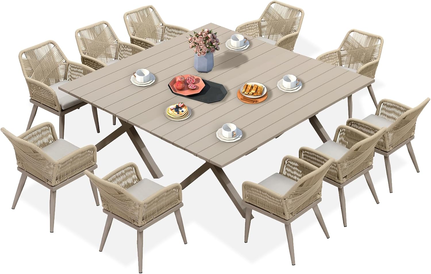 PURPLE LEAF 12 Pieces Outdoor Patio Dining Sets All-Weather PE Rattan Furniture Set with All Aluminum Frame Outdoor Table and Chairs Set for 10 People Lawn Garden Backyard Deck, Champagne