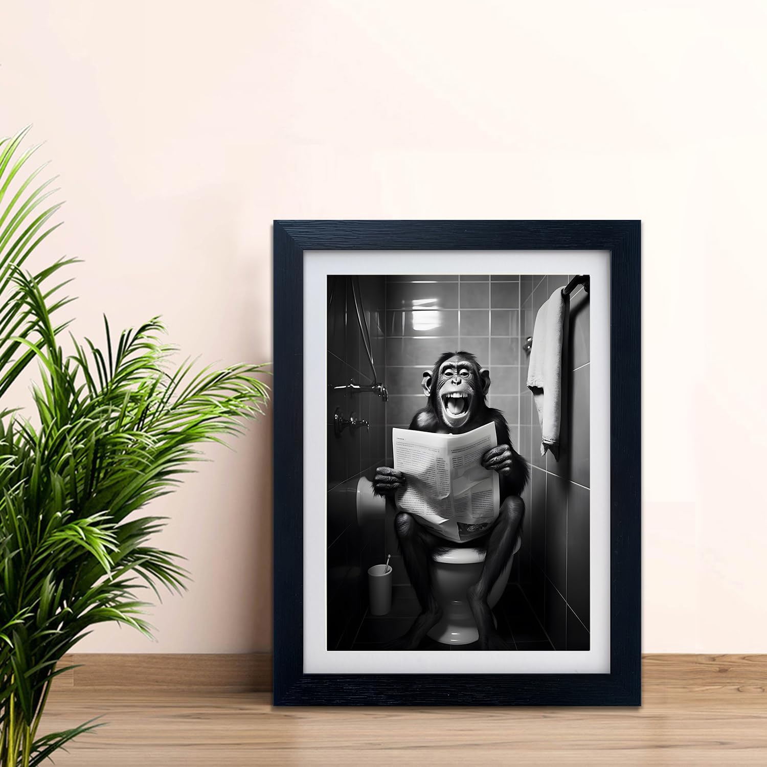 Framed Black and White Animal Bathroom Canvas Wall Art Monkey Reading Newspaper Toilet Humor Decor Funny Bathroom Sign Wall Decor