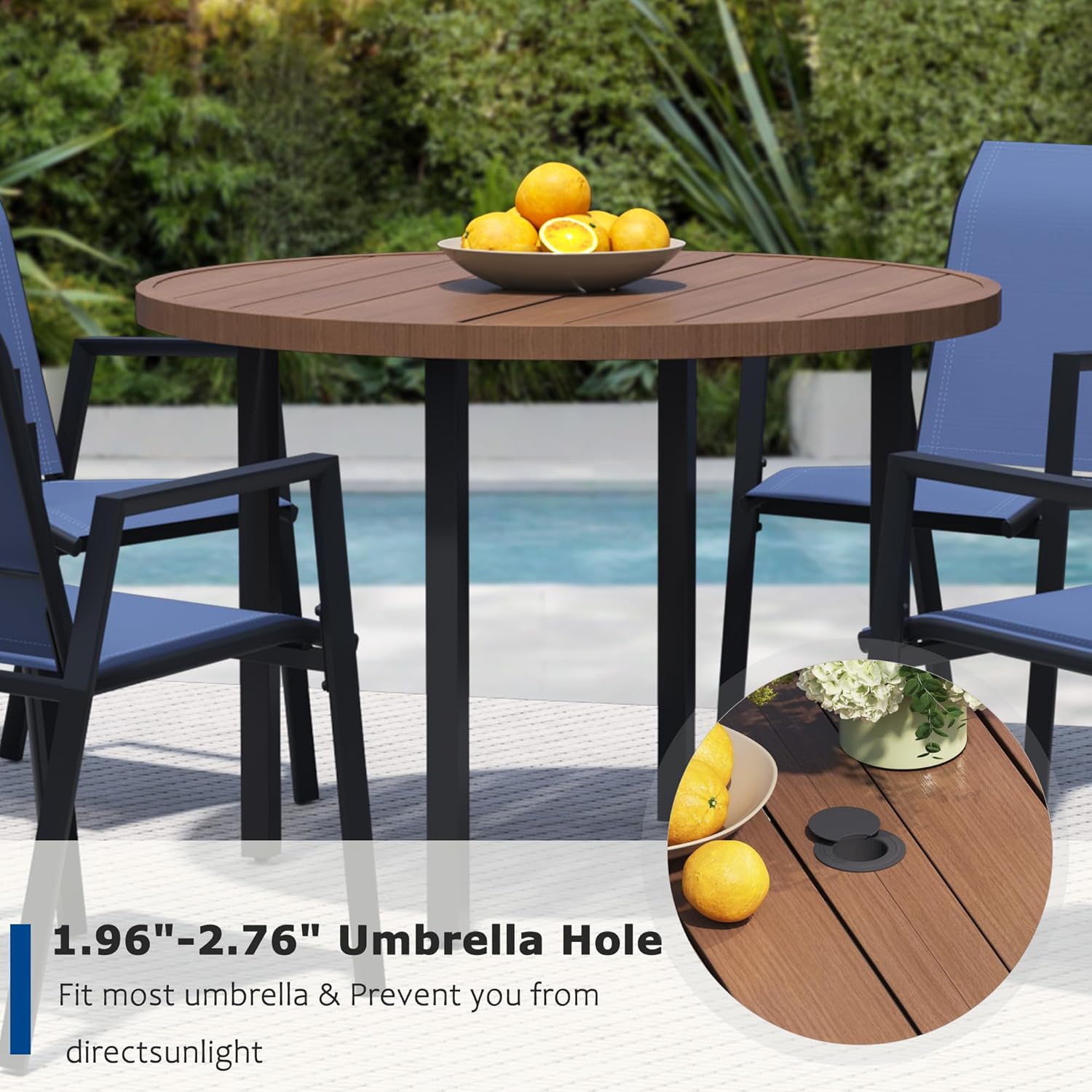 5 Piece Outdoor Dining Set, Patio Table and Chairs Set of 4, 42" Walnut Round Patio Table with 4 Blue Stackable Patio Chairs for Lawn, Garden, Porch