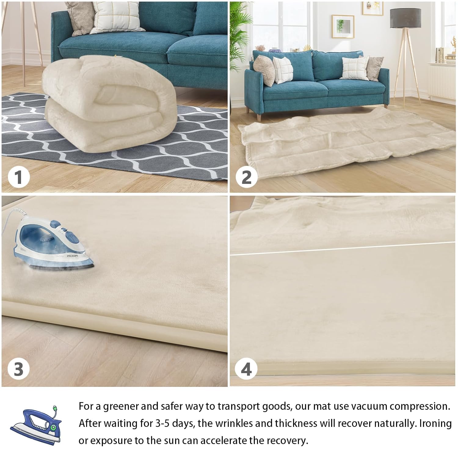 - ๐HOW TO CARE FOR YOUR MAT:When you open the package,it may be wrinkled,very flat and inelastic.Don't fret - this is normal! As long as it is left for 3-5 days, the mat will naturally regain its thickness and elasticity. we recommend steaming or ironing it to speed up recovery. After you have completed the steaming/ironing, your thick floor padded mat should rebound and be ready to use!