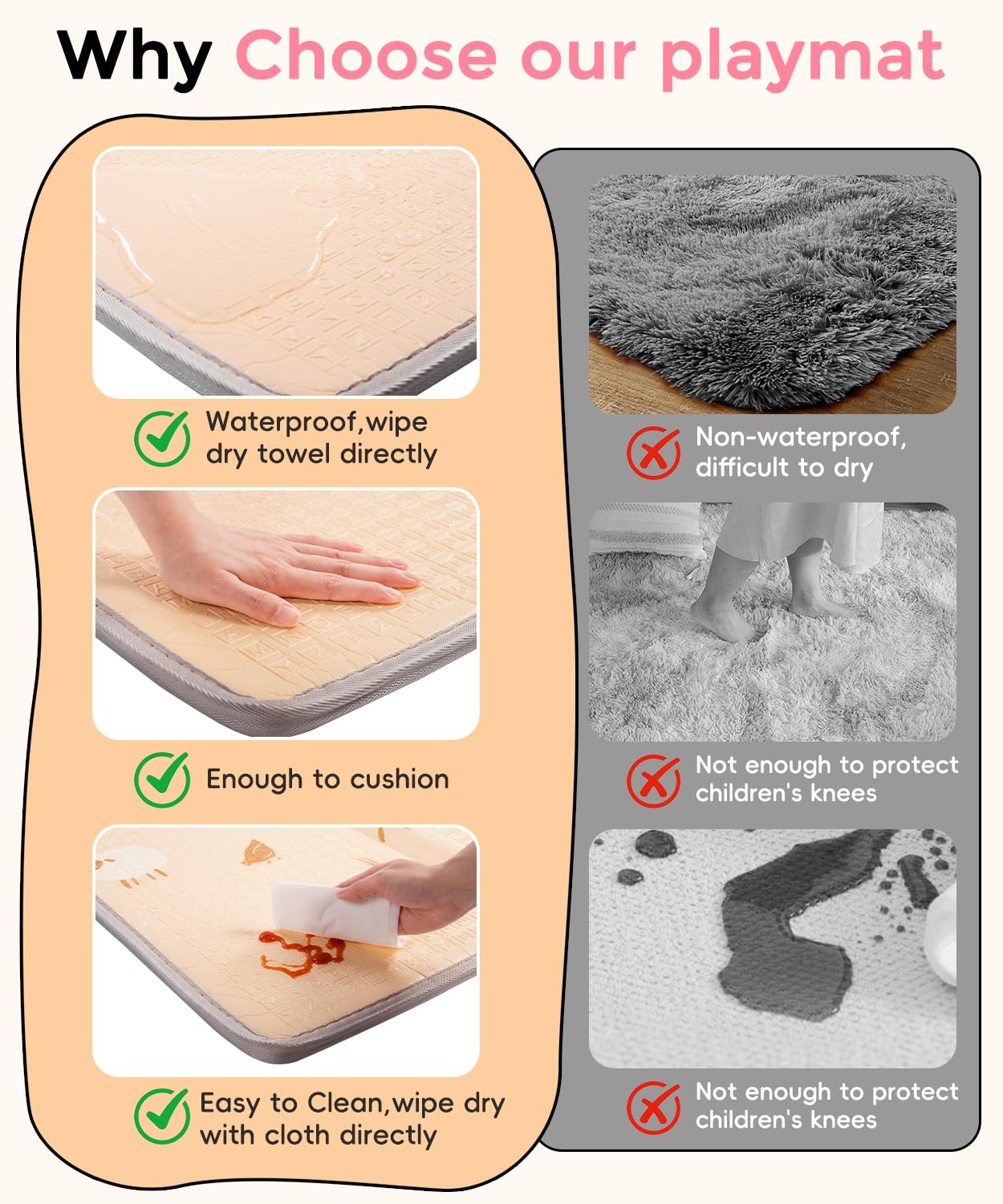 - 【Waterproof & Durability】Our baby play mat is with 100% waterproof surface,and also easy to clean. Just wipe it down with wipes or tissues. The waterproof surface layer also protect pattern color from falling off, exactly durable to use.
