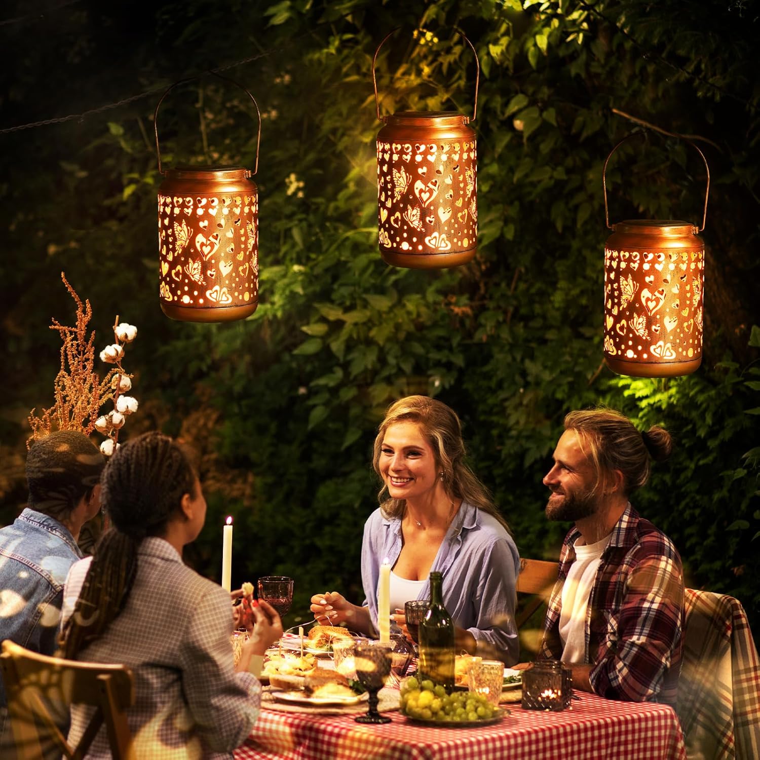 - Elegant Decorative Design:Inspired by timeless artistry, our solar love heart outdoor lanterns boast a vintage-inspired golden copper finish and intricate hollow-cut metal detailing. As darkness falls, the solar lanterns outdoor cast a radiant, warm glow through their delicate patterns, adorned with graceful Love Hearts motifs that dance across surfaces, transforming gardens, patios, or pathways into a captivating oasis of elegance