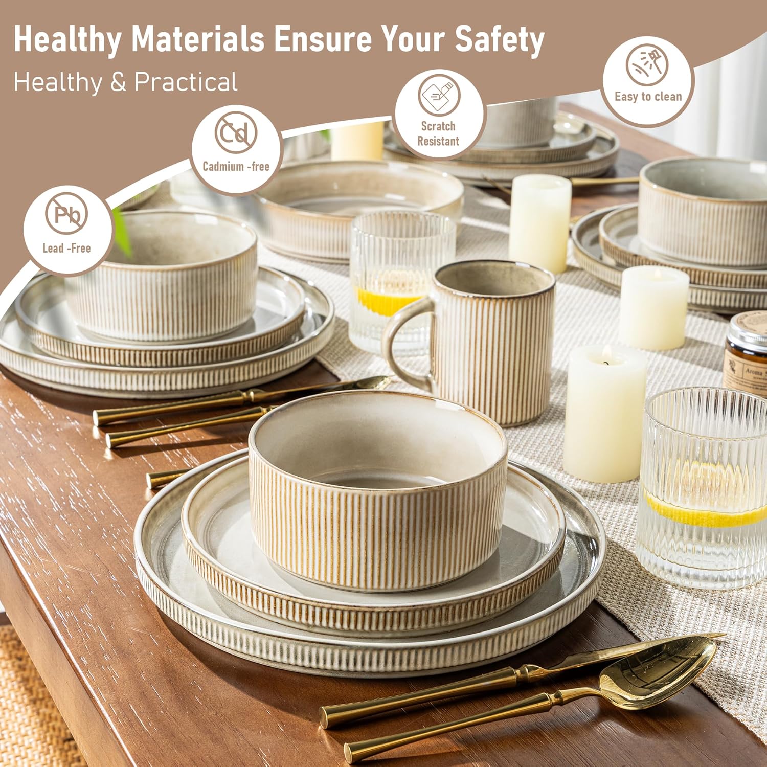 - Healthy, Lead-Free & Chip-Resistant: Crafted from premium, double-fired ceramic, this dinnerware is lead-free and cadmium-free, ensuring no harmful chemicals leach into your food. The durable stoneware construction makes it exceptionally chip-resistant and built for long-lasting daily use.