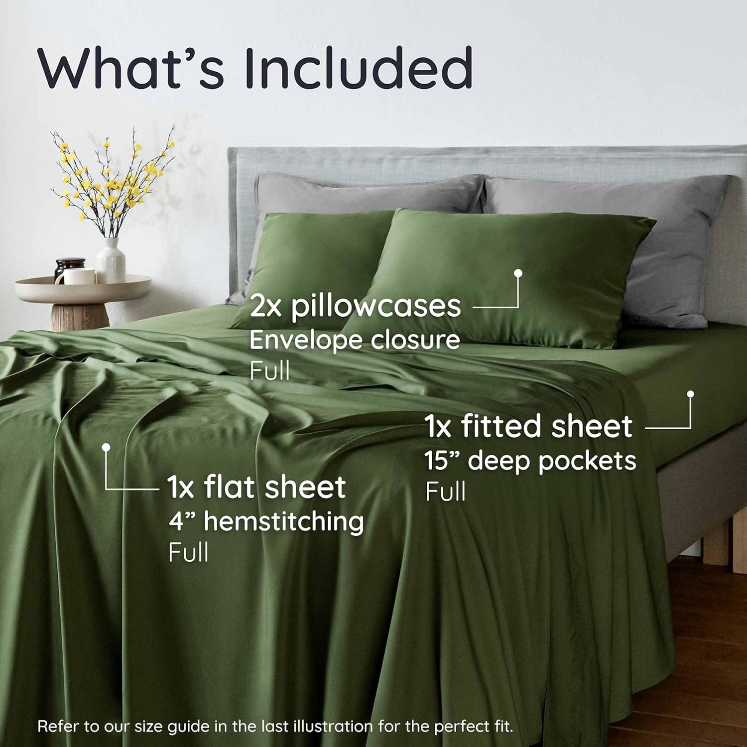 - Your Perfect Bedding Set: This set of 100% viscose derived from bamboo full size sheets includes 1 full fitted sheet (54" x 75"), 1 full flat sheet (81" x 96") and 2 queen pillowcases (20" x 30"). The pillowcases feature a sleek 8" envelope closure flap for a polished look and a secure fit, while the flat sheet is finished with an elegant 4" hem.
