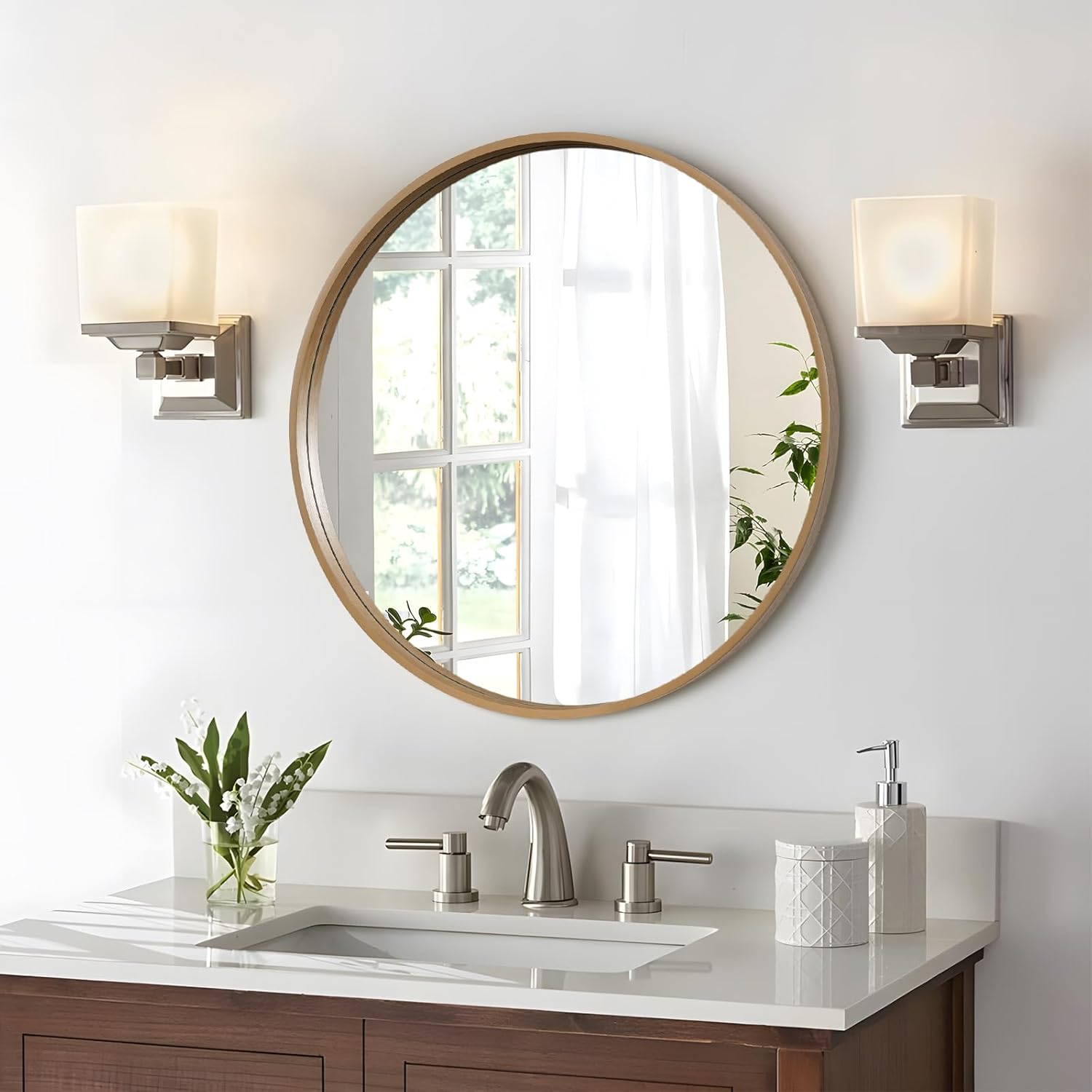 WallBeyond Round Wood Mirror 28" Circle Wall Mirror for Bathroom Round Wall Mirror for Wall Decor, Vanity, Entryway Living Room, Honey