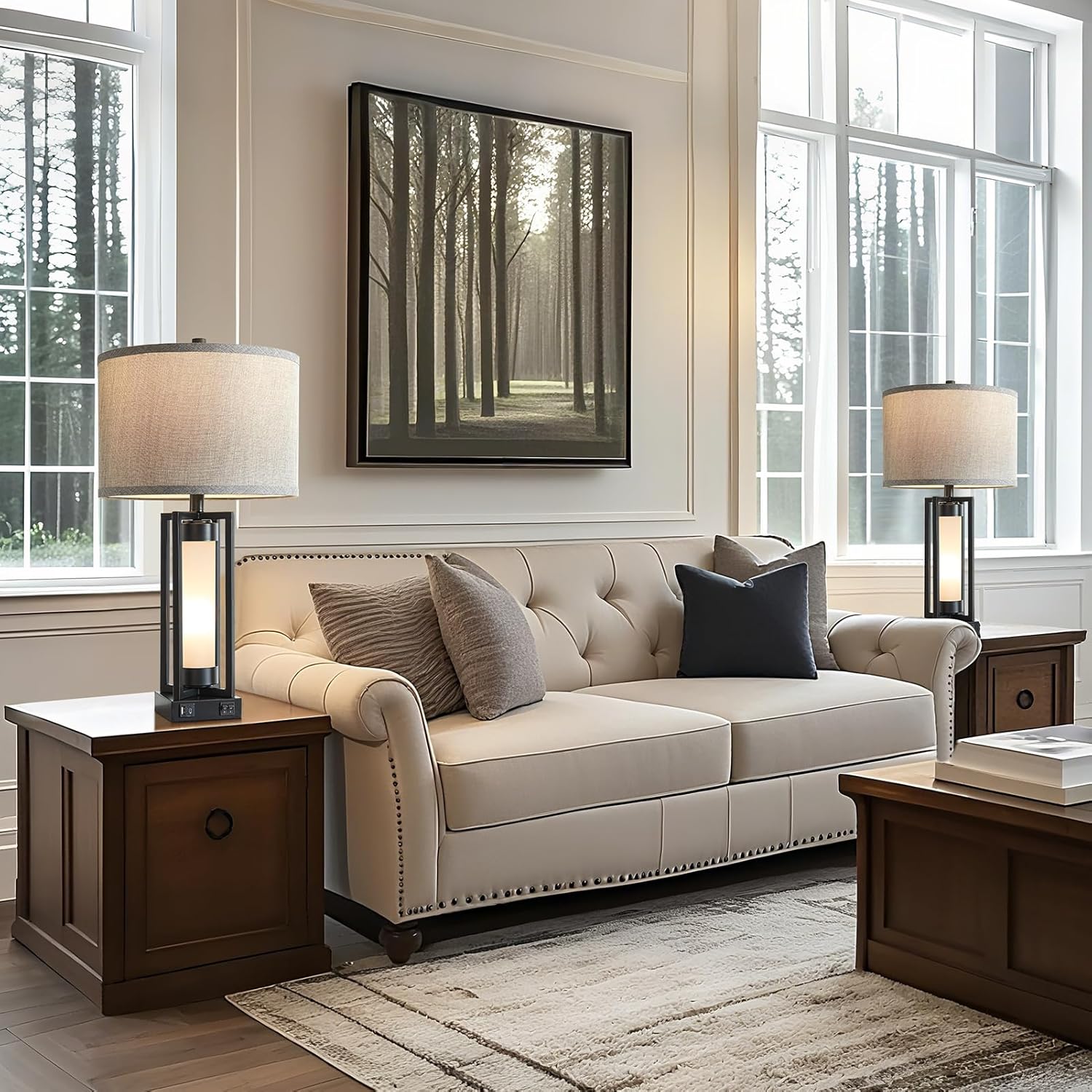 RORIANO Set of 2 Modern Table Lamps for Living Room with USB C+A Ports, Rustic Nightstand Lamp with White Night Light, Retro Desk Lamp for Bedroom End Table Entryway, 4 Bulb Included (Black)
