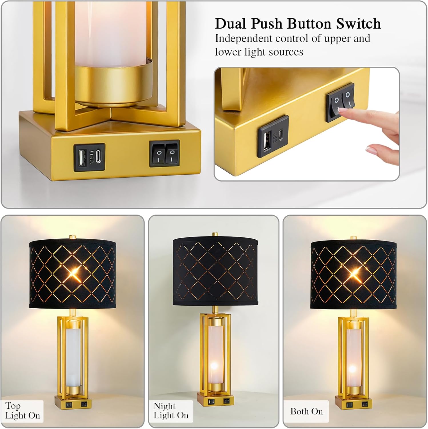 RORIANO Set of 2 Modern Table Lamps for Living Room Bedroom with USB C+A, Rustic Nightstand Lamps with White Night Light, Black Grid Shade, Desk Lamps for Bedside End Tables, 4 Bulbs Included (Gold)