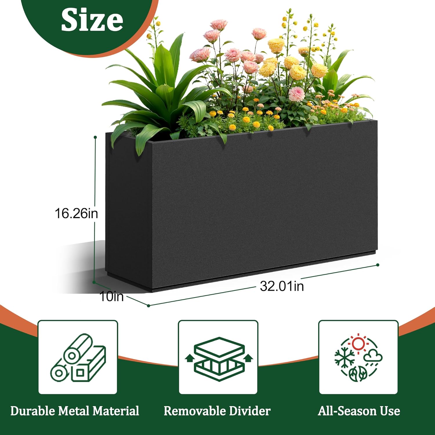 Large Rectangle Planter Metal Black Planter Box with a Drainage Hole and a Removable Divider Indoor Outdoor Porch Pots for Tall Plants, Trees, Flowers 32.01" x 10"x 16.26" Black