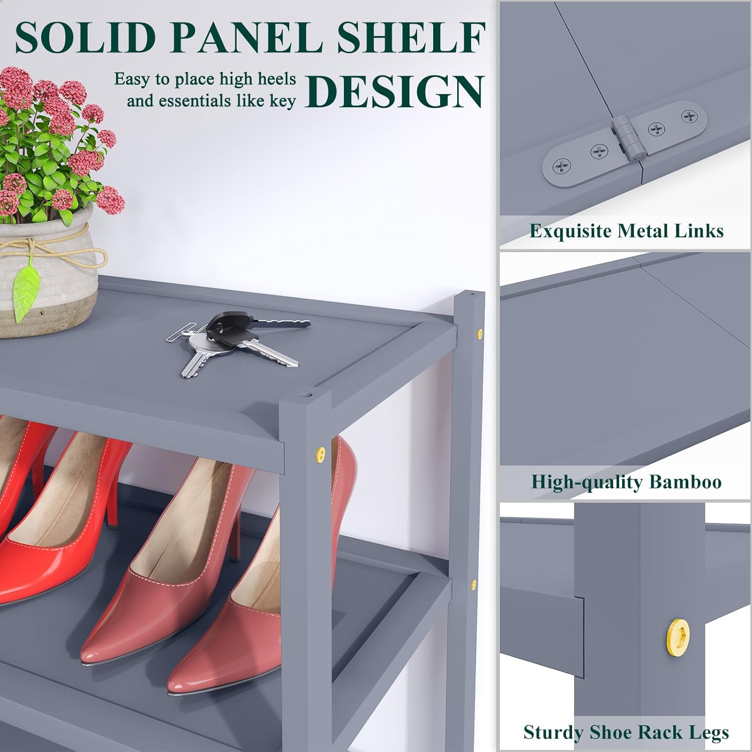 • Thoughtful Design Details – The flat panel shelf holds high heels but also provides extra space for small items such as bags, keys, or decorative pieces