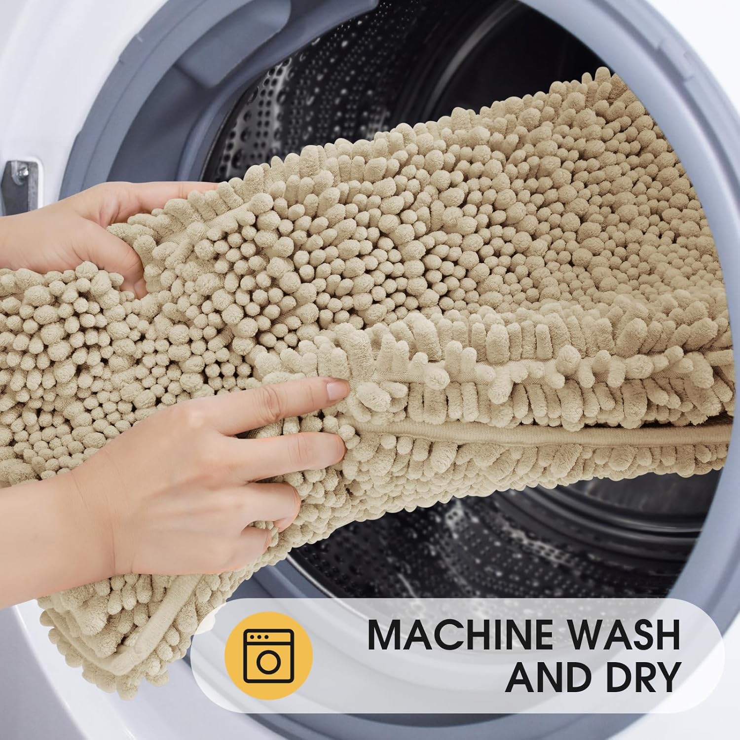 - SUPERIOR ABSORBENCY: The bold pile chenille on the top surface of the luxurious toilet mat soak up a lot of water and keep your floor dry when you're stepping out of the bath, Bathtub, shower, or getting ready by the sink, moisture is trapped in the bathroom rug’s deep pile, to avoid the dripping water disturbing your bathroom's serenity and tidy.
