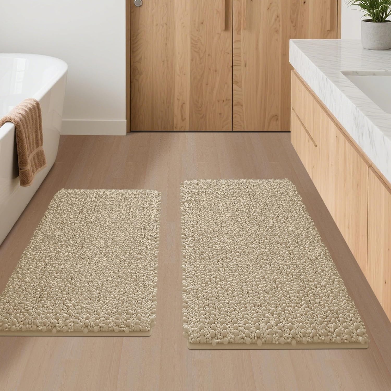 ACCUMTEK Upgrade Luxury 2 Piece Beige Toilet Bathroom Rug Mat 32"x20"+24"x17", Ultra Soft Thick Absorbent Bath Mats, Non Slip Chenille Toilet Mat for Bathroom, Bedroom, Kitchen, Shower, Tub