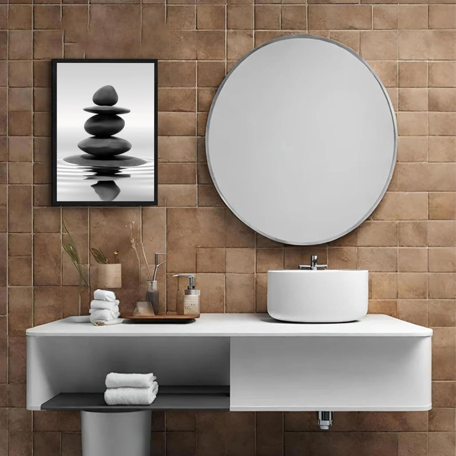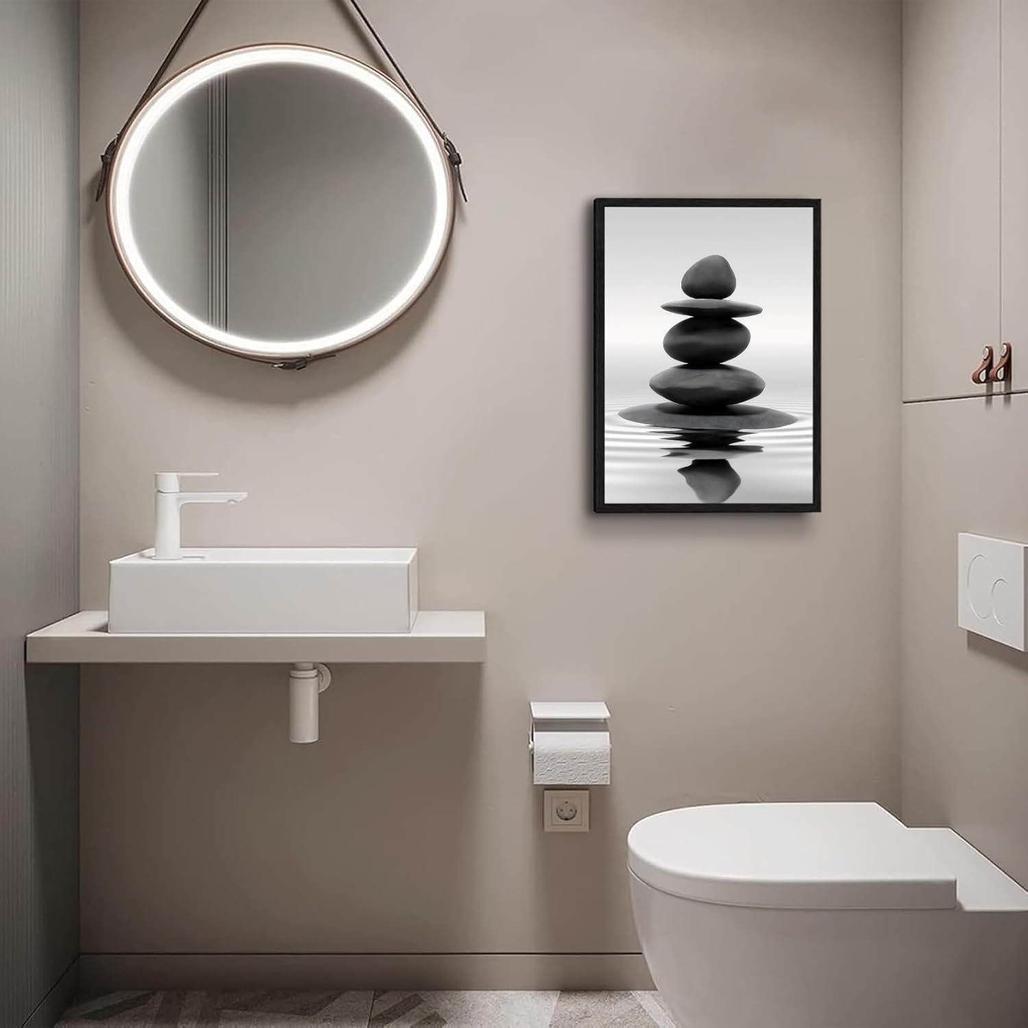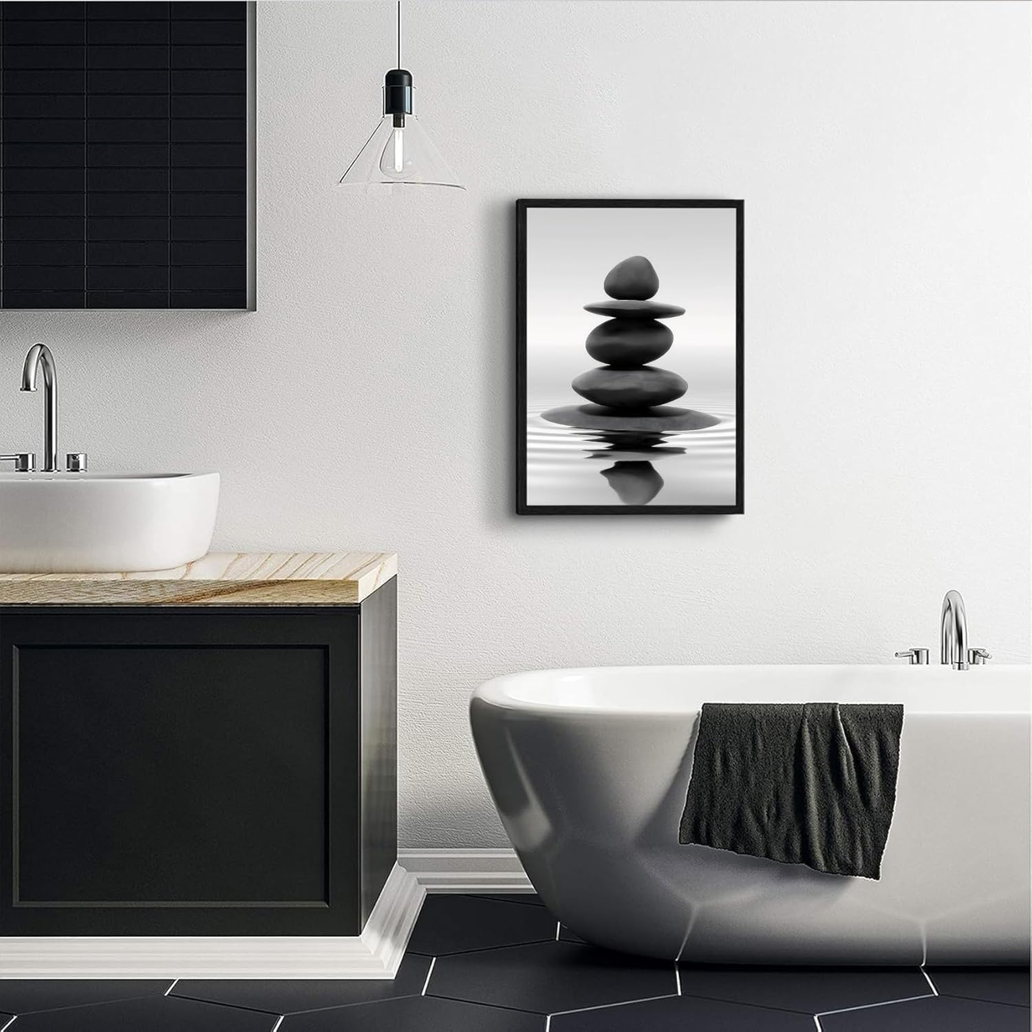 • Black and White Bathroom Wall Art: Featuring an elegant depiction of stones resting in water, this black and white artwork evokes a sense of tranquility and zen, perfect for any calming space.