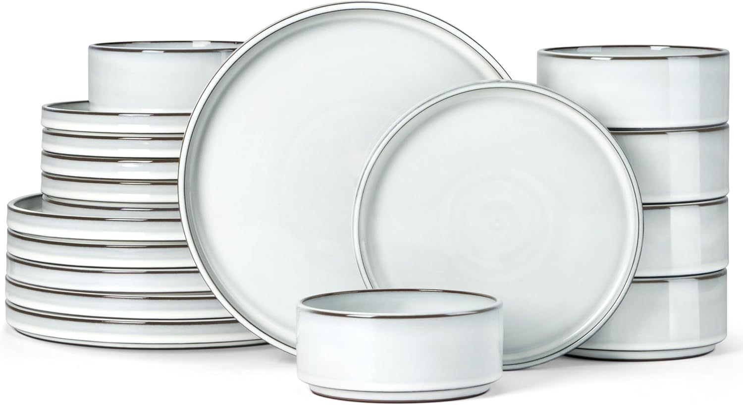 - Exquisite Reactive Glaze, the ceramic dishes set showcases a icy white glaze finish that adds a touch of elegance to your dining experience, the top edge also glazed with a dark brown rim that adds a unique charm to the dinnerware, the elegant and refined look will impress your family or guests, making every meal a special occasion