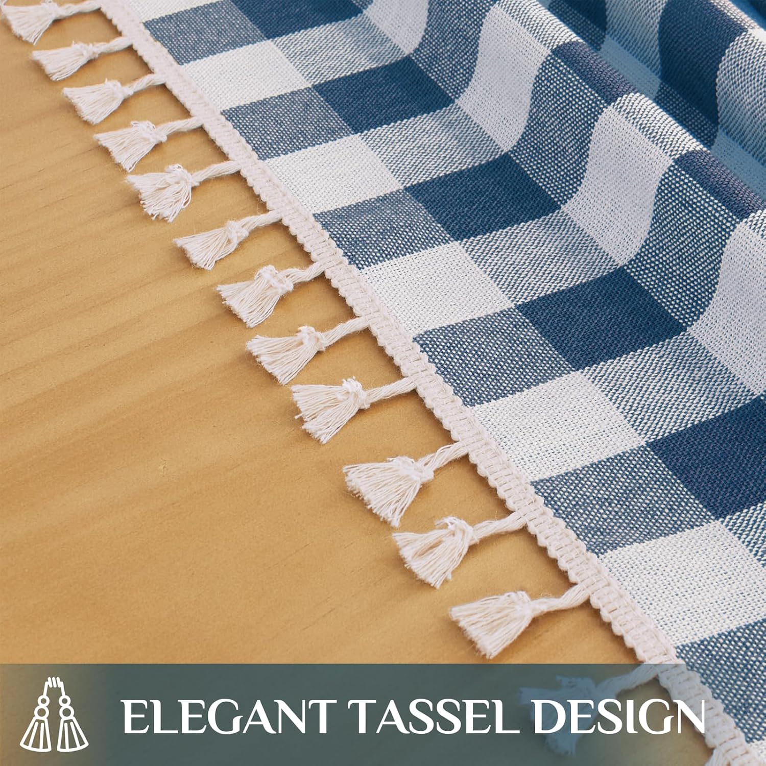 • CLASSIC GINGHAM TABLECLOTH WITH TASSELS: Featuring the timeless navy and white buffalo check pattern with playful tassel fringe, this tablecloth for 6 foot rectangle tables blends rustic, farmhouse charm and modern elegance to create a cozy, inviting dining atmosphere.