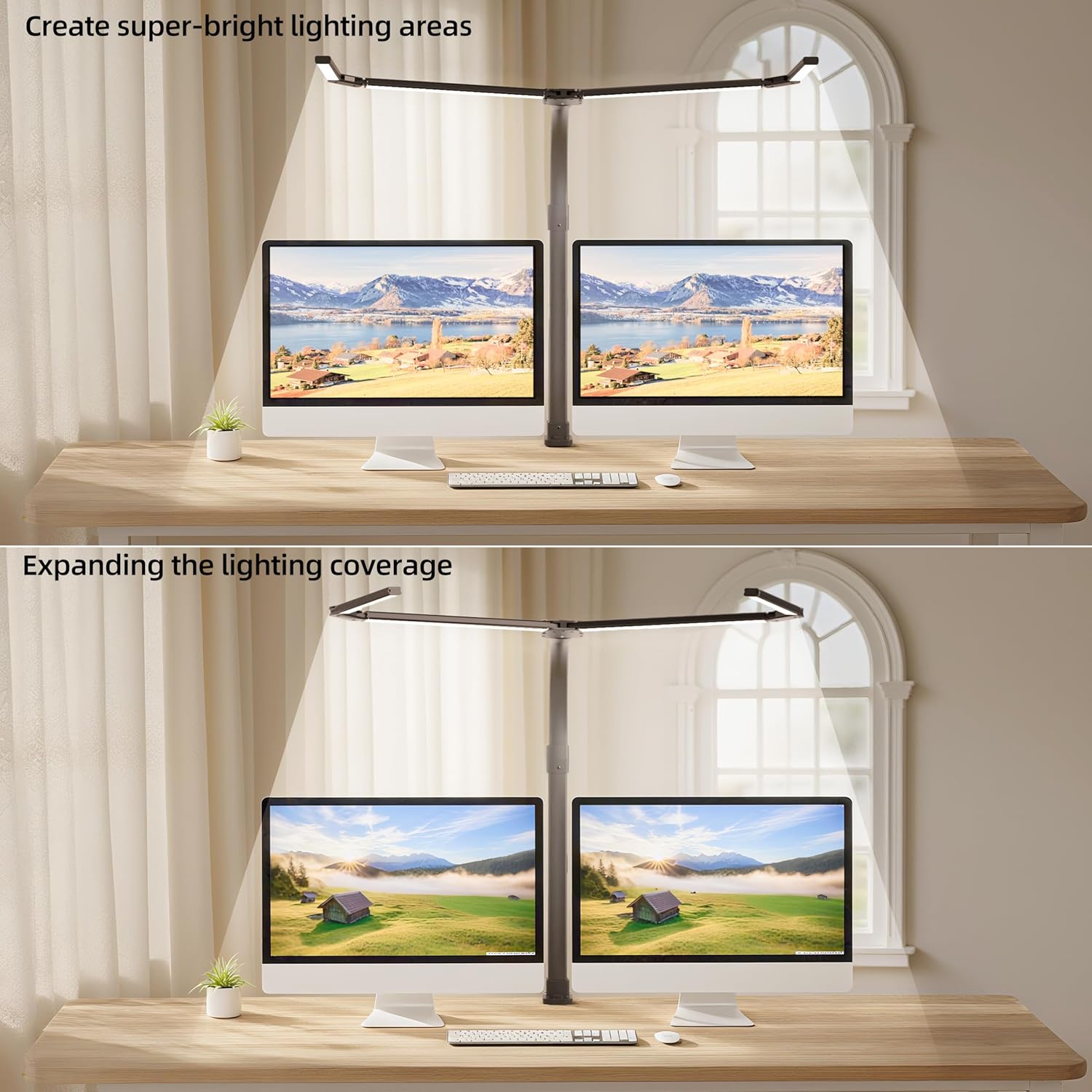 - 1800 Lumen Super bright, wide coverage lighting:This work light is equipped with 42inch double retractable arms and high-quality LED light strips. It can be folded or unfolded, and can evenly illuminate the entire tabletop with clear and flicker-free light. Moreover, the swivel part allows you to adjust the height or position of the lamp, which is very practical. Whether you are using a monitor, laptop, reading or writing, every corner of the working area can receive uniform lighting - there are no shadows or dark spots anymore! It is very suitable for large tables or environments with multitasking.