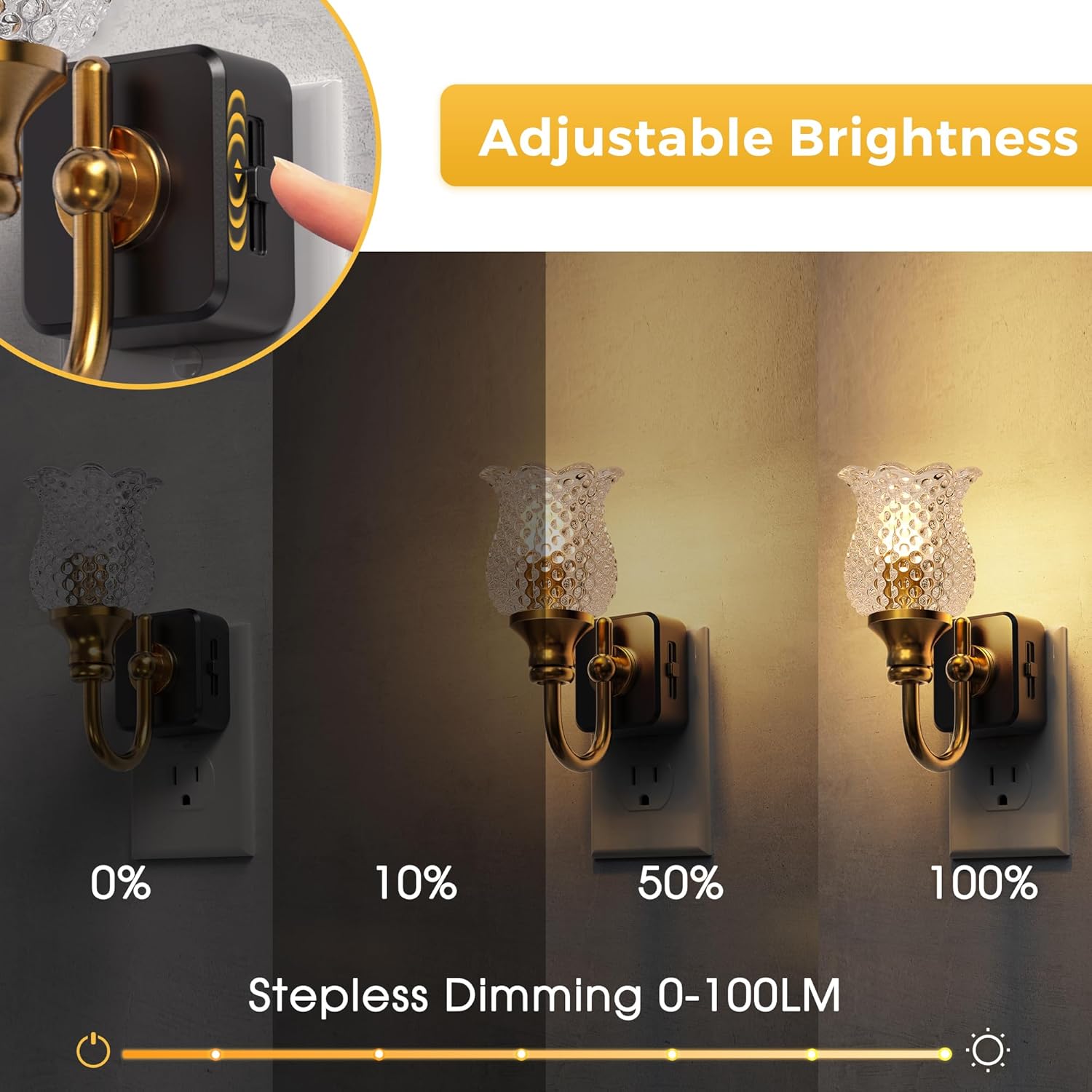 • 0-100LM Dimming Plug in Night Light:Features innovative slide-to-dim technology for continuous brightness adjustment from 0% to 100%. Customize the 3000K warm white light intensity, allowing perfect control from a subtle night glow to ample soft illumination for any need.