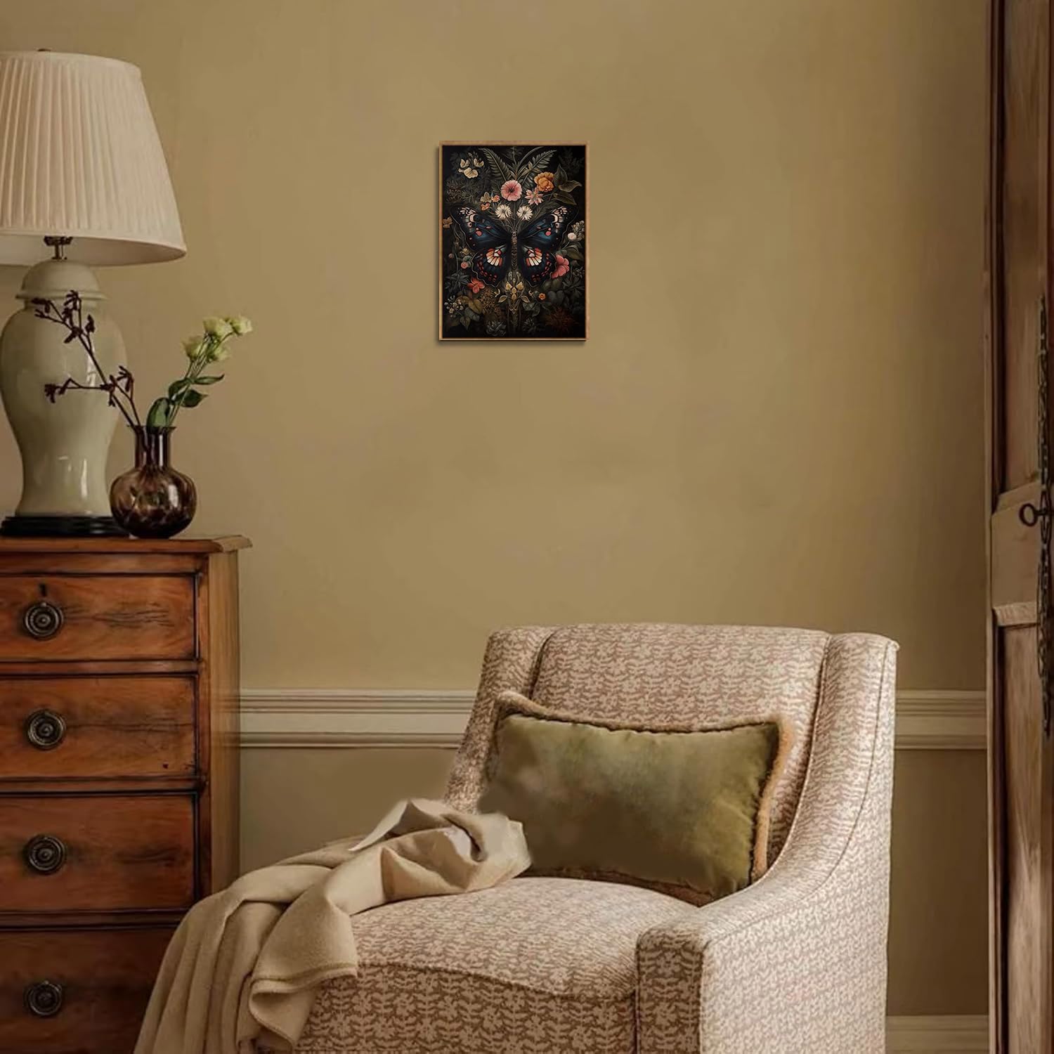 Djmwtb Vintage Framed Wall Art Butterfly Canvas Wall Art Prints Gothic Botanical Floral Pictures Dark Academia Flower Painting Wall Decor Artwork for Living Room Bedroom Bathroom Office 16x24in