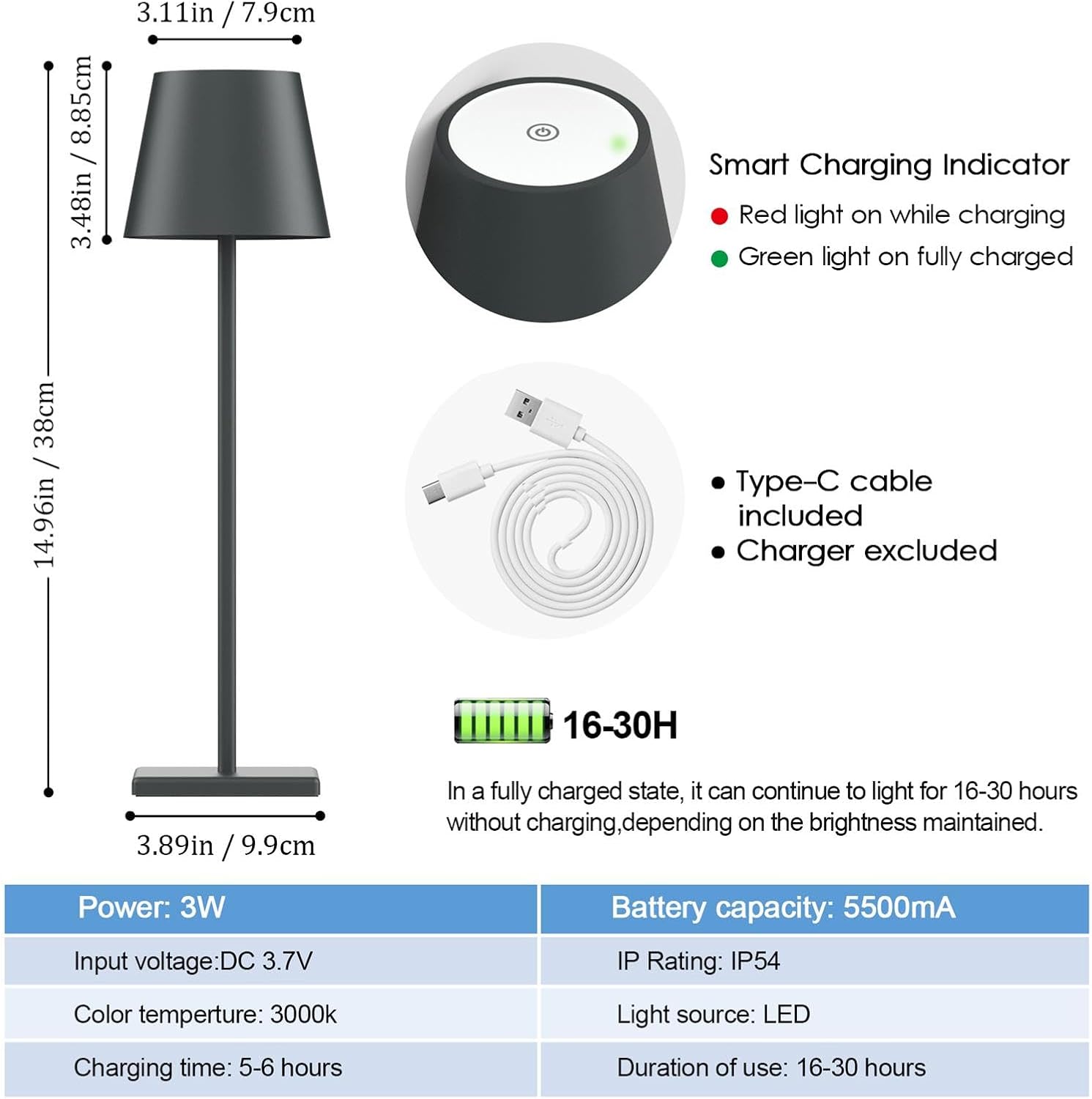 • 【Aluminum Metal Table Lamp】 High capacity battery, Type-C charging port, 5-6 hours of charging, 16-30 hours of use; Power 3W; Input voltage: 3.7V; High quality metal aluminum + acrylic lampshade; Size 4.37LxH 15.2 inches; Push button switch control; IP65 waterproof, can be used outdoors.