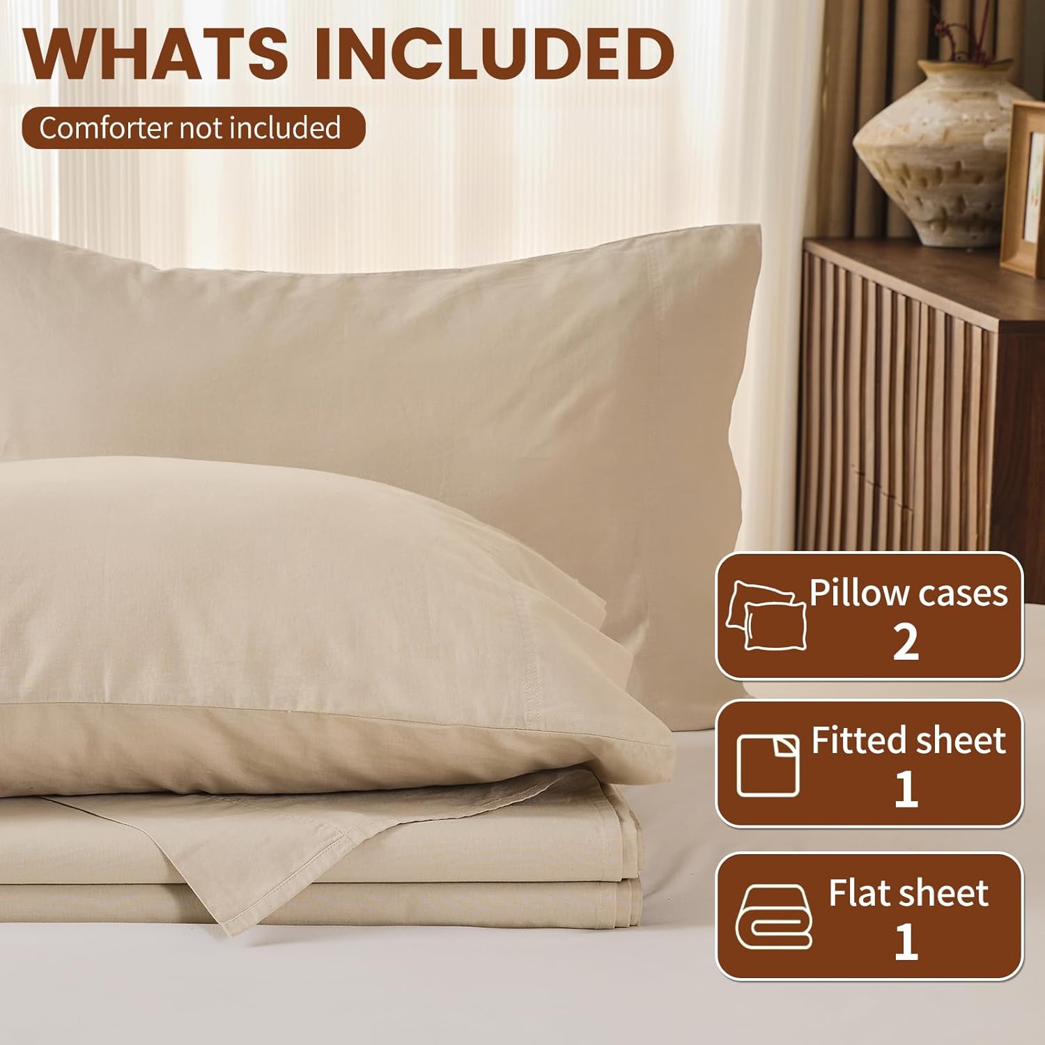 • Complete 4-Piece Queen Linen Sheet Set:This premium set includes:1 Flat Sheet (90" x 102") + 1 Fitted Sheet (60" x 80" with 16" deep pocket) + 2 Pillowcases (20" x 30") Fits standard & queen pillows.Designed for mattresses up to 16" thick, these linen sheets stay securely in place all night