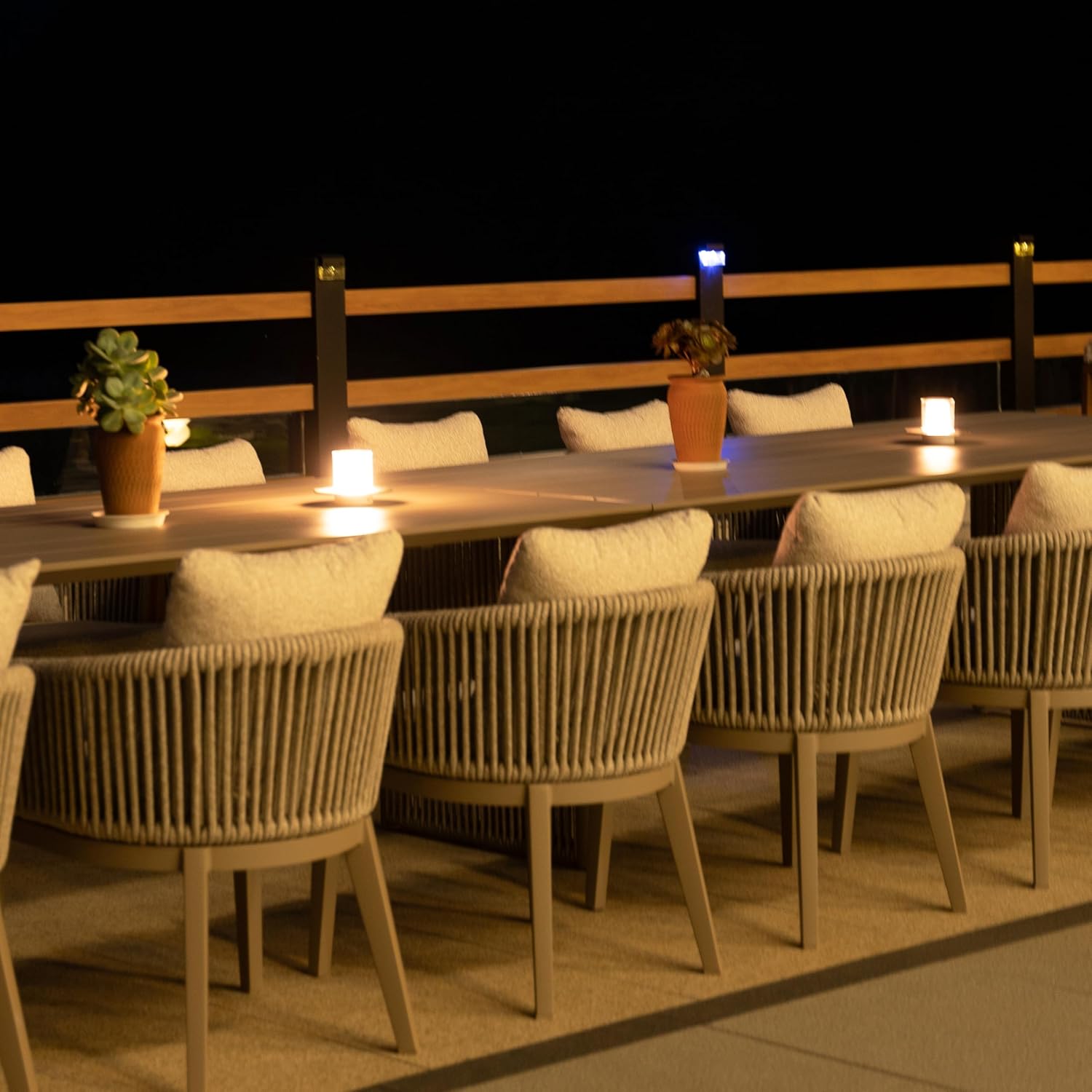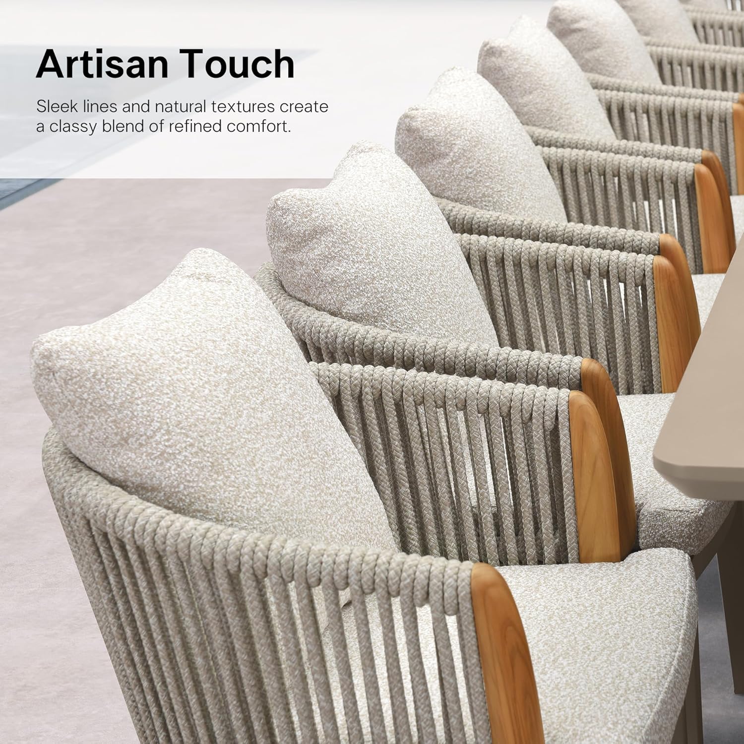 • Teak & Rope Accents: The outdoor dining chair features durable hand-woven 0.6" thickened rope backrests and smooth teak wood armrests that add natural elegance and strong support.