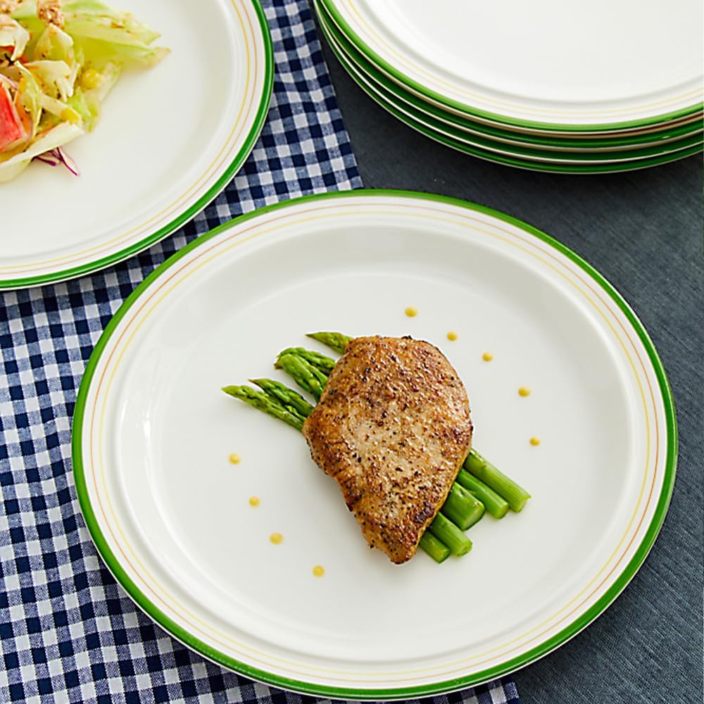 • DINNER PLATES FOR 6: Each plate measures 10.5" in diameter. Perfect for main course pasta, salads, sandwiches, and steak, they are also suitable for foods with soup. These dinner plates feature a lip around the entire edge to prevent food from running away.