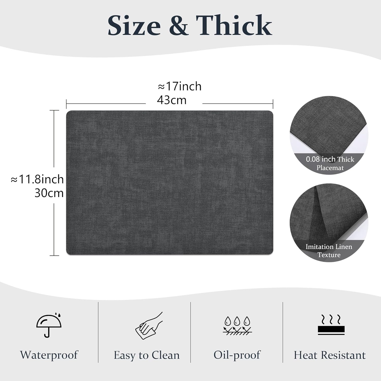 FROMHEART Faux Leather Placemats Set of 8–Waterproof,Heat/Oil Stain-Resistant PU Table Mat–Reversible,Non-Slip,Easy to Clean Place Mats for Kitchen,Dining,Indoor/Outdoor,(Dark Grey,11.8" x 17")