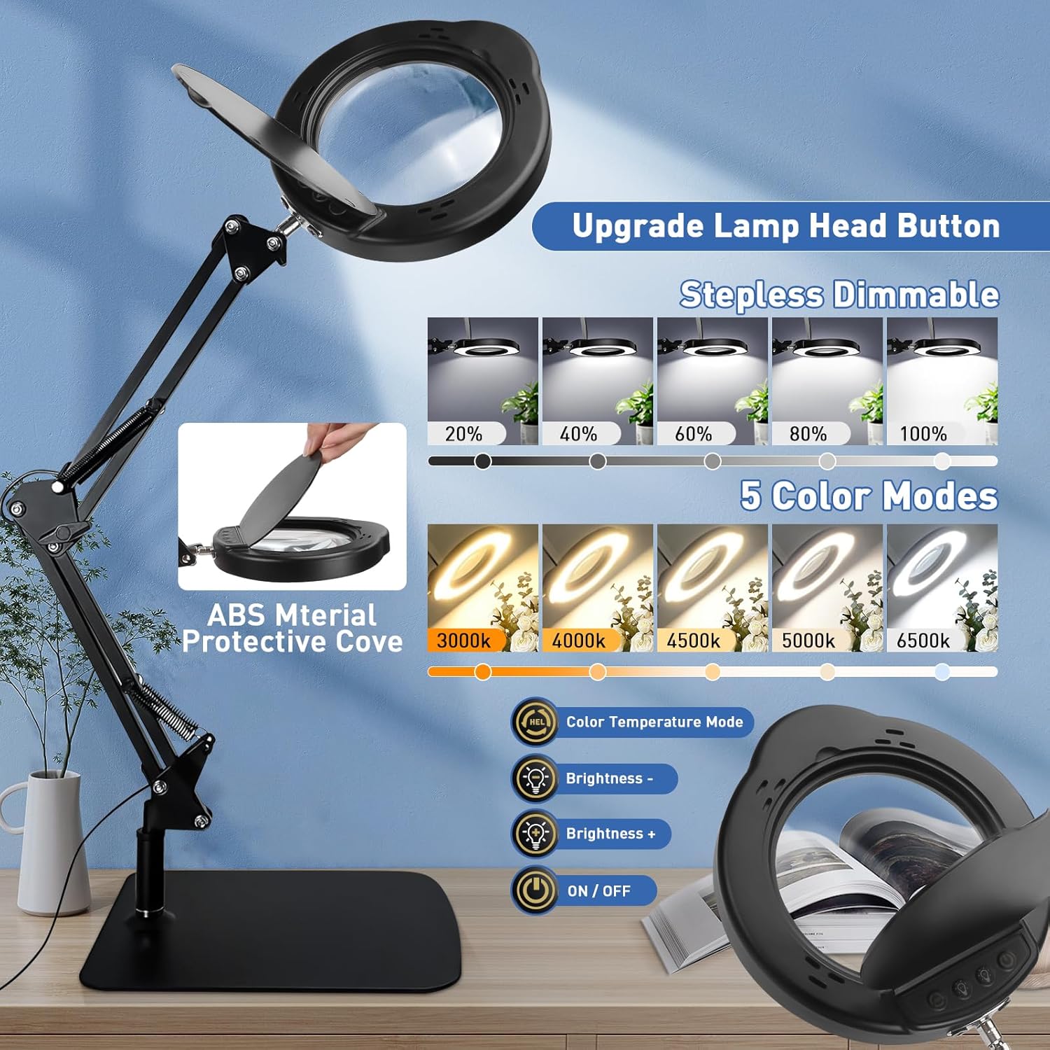 - 【5 Color Modes & Stepless Dimmable】This magnifying lamp with light provides 5 color temperature settings and stepless brightness dimming,allowing customized brightness from 5% to 100%,with a maximum output of 1600 lumens.High quality ring LED lights provide you with uniform and flicker free light,clear and shadow free vision,and reduce eye fatigue.Its built-in storage IC can remember the last lighting settings,ensuring consistent and personalized lighting every time it is used