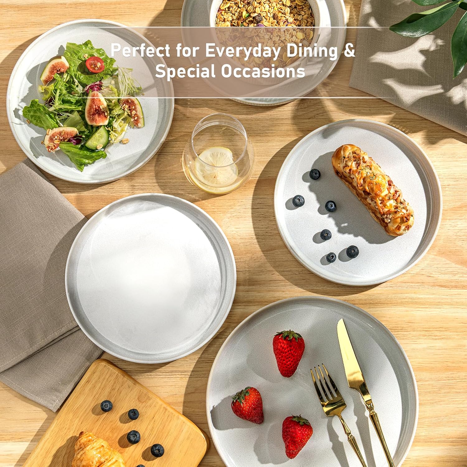 - Modern Design with Sauce Guard Edge: Features a sleek, modern minimalist design that elevates any table setting. Each piece boasts a subtle raised rim that acts as a sauce guard, effectively preventing gravy, dressings, and sauces from spilling over the edges.