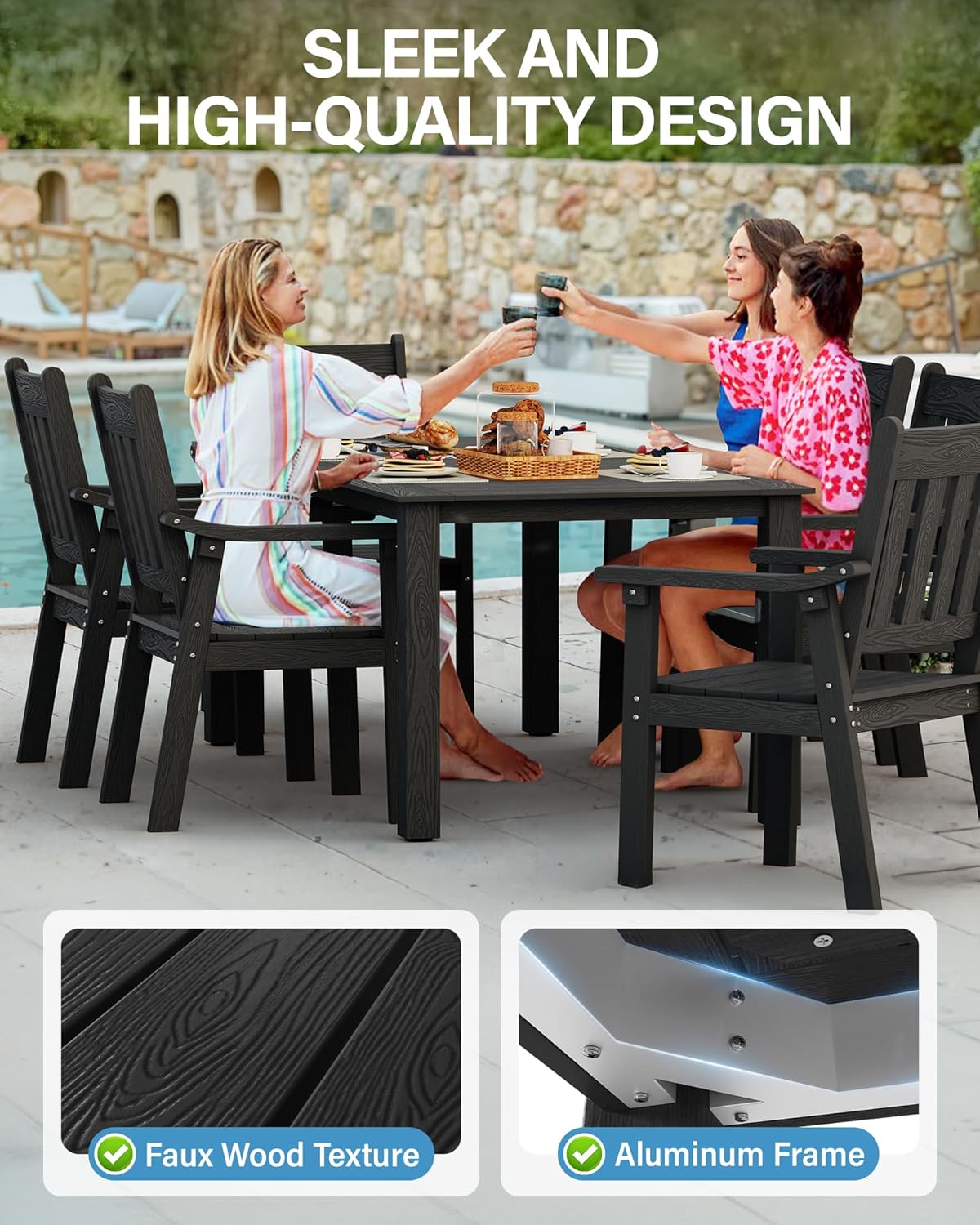 - Upgrade From HDPE to HIPS Material to Service Outdoor Condition Better: YEFU outdoor dining set for 10 is made of upgraded HIPS material which is harder than HDPE and more suitable for making patio table and chairs. HIPS make it not deform and maintain shape in cold and humid environments. It can withstand harsh weather conditions such as UV rays, rain, and wind. The outdoor dining table and chairs do not require special storage when placed outdoors and is suitable for patio, lawn, garden, porch, backyard, deck, pool, balcony