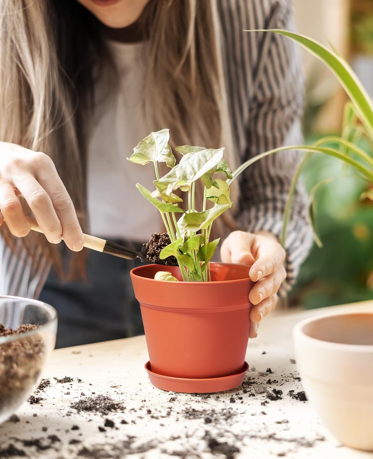 - 【Excellent Drainage System and Matching Tray】The porous drainage design of this plastic plant pots solves the drainage problem,and the small holes of arranged at the bottom can ensure that the drainage system will not be blocked and it also will not cause soil leakage.And pots for plants are provided a removable tray to collect excess water without worrying about leaks and damage to the floor,perfect for indoor use.