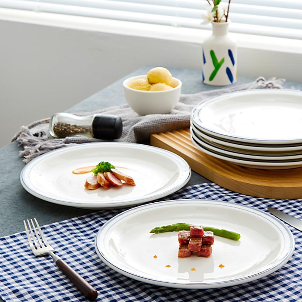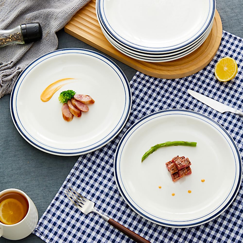 • DINNER PLATES FOR 6: Each plate measures 10.5" in diameter. Perfect for main course pasta, salads, sandwiches, and steak, they are also suitable for foods with soup. These dinner plates feature a lip around the entire edge to prevent food from running away.