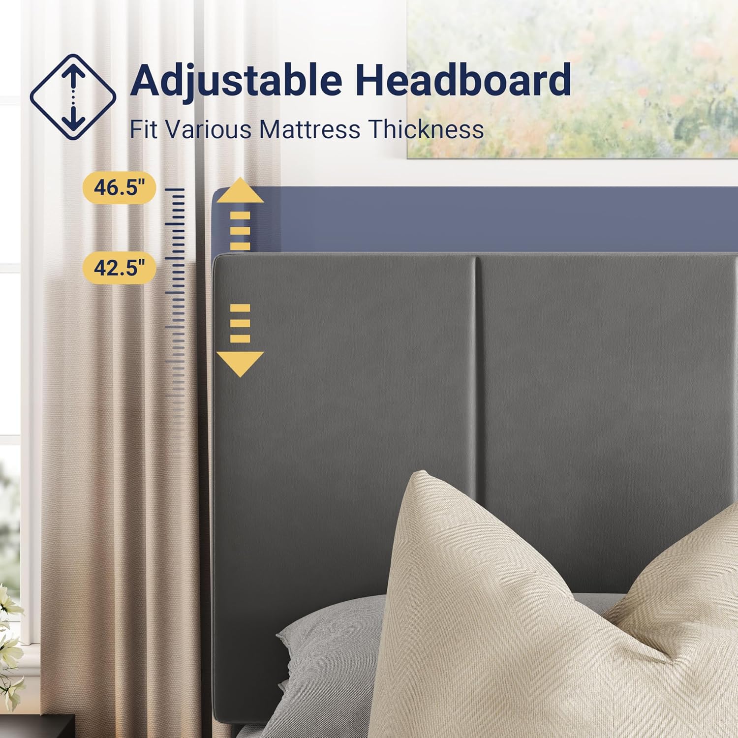 • Adjustable Headboard: 2 kinds of headboard height levels,42.5 inches and 46.5 inches, making this bed frame suit various mattress thickness